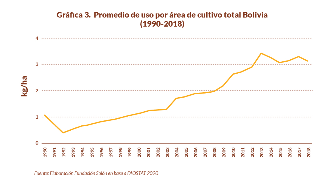 El aumento de cultivos de soya correspondió a una política gubernamental enmarcada en el contexto histórico global; el cual, como señala la “Estrategia para la transformación productiva del agro” (Ministerio de Hacienda, 1996), procuraba una “modernización” de la agricultura y potenciar las bondades económicas del modelo agroindustrial exportador (soya) frente al “estancamiento” tecnológico y productivo de la agricultura tradicional. Esta “modernización” e industrialización de la agricultura implicó, asimismo, un aumento en el uso de paquetes tecnológicos como los plaguicidas. Así pues, el uso de plaguicidas por área de cultivo pasó de 0,74 kg por hectárea en 1991 a 1,24 kg por hectárea en 2001 (Gráfica 3).