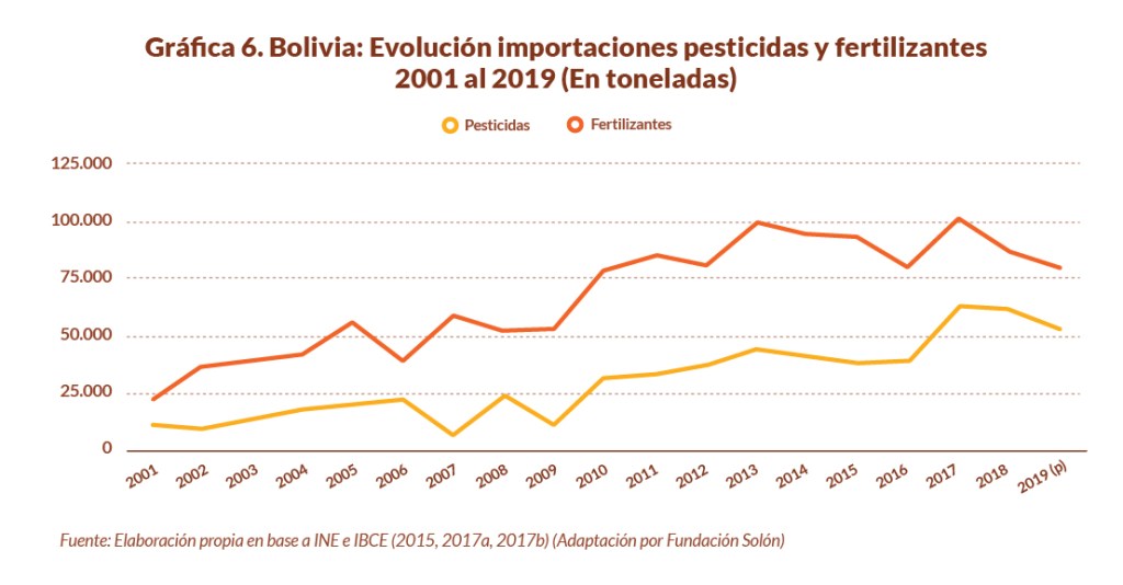 La gran mayoría de estos agroquímicos es consumido por el sector agroindustrial. De acuerdo al Instituto Boliviano de Comercio Exterior (IBCE), el 63% de los pesticidas que se introducen al país está destinado al sector agropecuario y un 25% va al comercio, el restante 11% se destina a la industria y el 1% a otras actividades (IBCE, 2019: 3). Un estudio publicado en 2019 señala que sólo en el municipio de San Pedro en Santa Cruz –uno de los municipios con mayor superficie cultivada con soya del país- el uso de agroquímicos en el sector soyero pasó de 12.691.000 kg en la campaña agrícola de 2002-2003 a 50.930.000 kg en la campaña del 2017- 2018. Esto es, un incremento del 301 % del uso de agroquímicos solo en este municipio agroindustrial soyero (Bascopé, 2019).