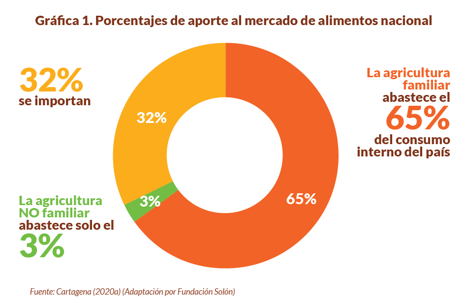 En Bolivia, la agricultura familiar campesina e indígena produce el 96 % de los 39 productos que conforman la canasta básica de alimentos: hortalizas, tubérculos, frutas, legumbres y cereales. El 65 % de los alimentos que consumimos en Bolivia son producidos por la agricultura familiar. Apenas el 3 % de los alimentos son producidos por la agricultura no familiar, y el restante 32 % es importado (Cartagena, 2020a). En otras palabras, la gran mayoría de los alimentos destinados a la canasta básica de los bolivianos provienen de la agricultura familiar campesina e indígena.