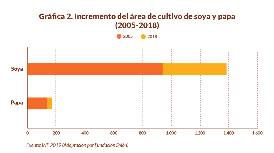 Siendo la agricultura familiar campesina e indígena el eslabón más importante para garantizar la seguridad y soberanía alimentaria nacional, este sector es el que menos creció en comparación a la agroindustria. Según los datos de la Asociación de Productores de Oleaginosas y Trigo (ANAPO, 2019), de 2005 a 2019 la superficie cultivada de soya se incrementó en 429.120 hectáreas: pasando de 930.500 a 1.359.620 de hectáreas respectivamente. Siendo que la mayoría de su producción se destina a la exportación. Entre 2005 y 2019 este sector exportó en promedio el 79% de su producción (Villalobos, 2021). En contraste, la superficie cultivada con papa se incrementó en 35.466 hectáreas entre 2005 y 2018. Mientras que la superficie cultivada con maíz, tomate, cebolla y haba aumentaron solo en 3.469, 1.162, 1.448 y 4.959 hectáreas respectivamente, durante el mismo periodo (INE, 2019).