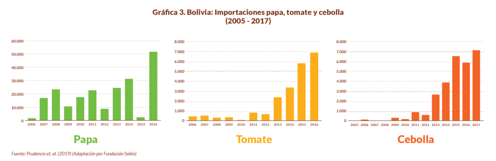 La falta de apoyo a la pequeña agricultura familiar campesina afectó profundamente la seguridad alimentaria nacional, haciendo de Bolivia un país cada vez más dependiente de los alimentos que se importan de los países vecinos. Las importaciones de papa, por ejemplo, pasaron de 1.282 toneladas en 2006 a 51.805 toneladas en 2016. De igual manera, las importaciones de tomates aumentaron quince veces pasando de 467 toneladas a 6.943 toneladas importadas en el mismo periodo. Mientras que, de no importar cebolla en 2005, en 2017 se importaron 14.328 toneladas (Prudencio, 2019).
