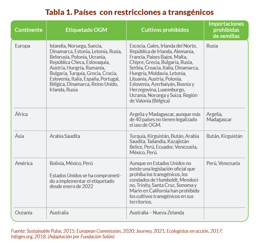 Actualmente, al menos 39 países han prohibido mediante leyes los cultivos transgénicos en sus territorios, sobre todo por motivos de salud humana y ambiental. Casi la totalidad de Europa prohíbe los cultivos transgénicos en su territorio y sólo permite la importación de algunos productos transgénicos bajo normas de etiquetado y sobre todo para consumo animal. La Unión Europea obliga etiquetar todos los productos transgénicos que tengan hasta milésimas de componente OGM, Estados Unidos se ha comprometido a implementar el etiquetado desde enero de 2022. Otros países que exigen etiquetados pero con más flexibilidad [4], son: Indonesia, Tailanda, Australia, Nueva Zelandia, África del sur, Kenia, Canadá, Brasil, Colombia, Nicaragua, Mali, Togo, China, Japón, Taiwan, Vietnam e India.