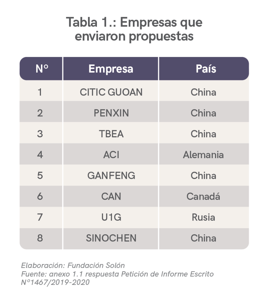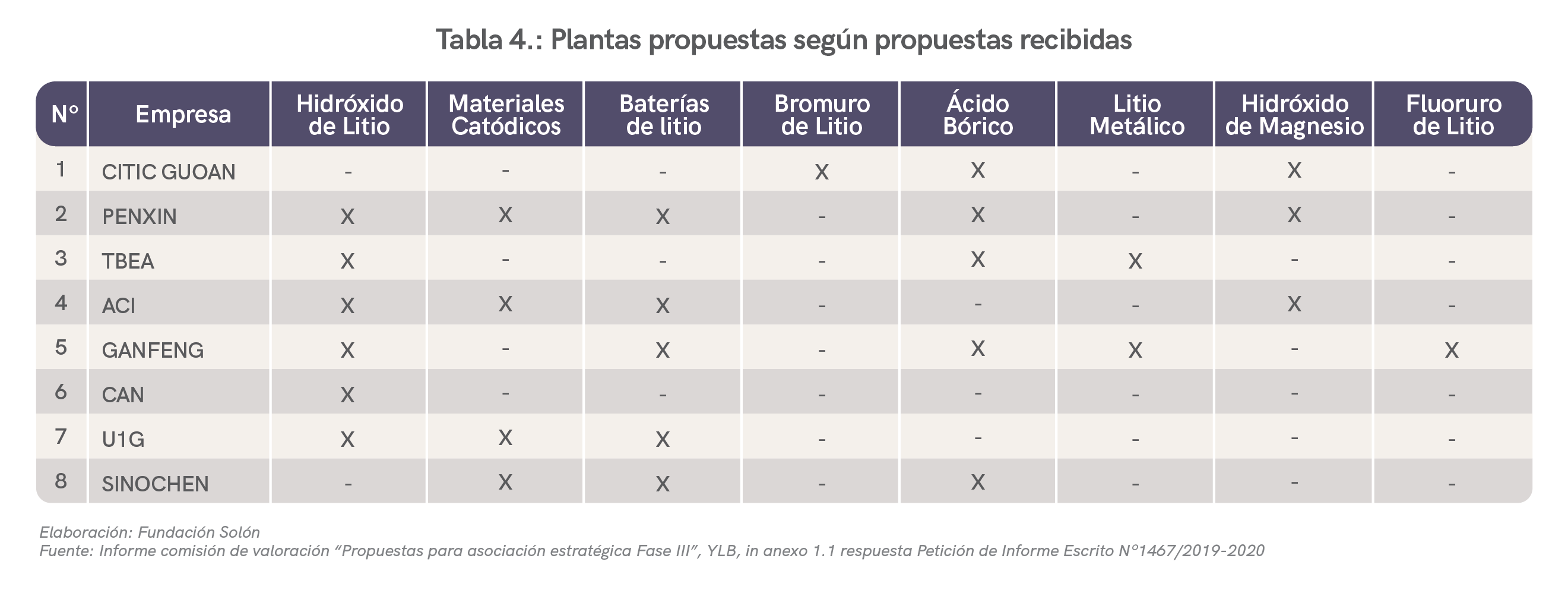 Sólo tres empresas, Pengxin (China), ACI Systems (Alemania) y Uranium One Group (Rusia), proponían construir las tres plantas “indispensables”. Otras tres proponen construir sólo la planta de hidróxido de litio: TBEA, Ganfeng y CAN. Sinochen propone construir sólo las plantas de materiales catódicos y baterías de litio.