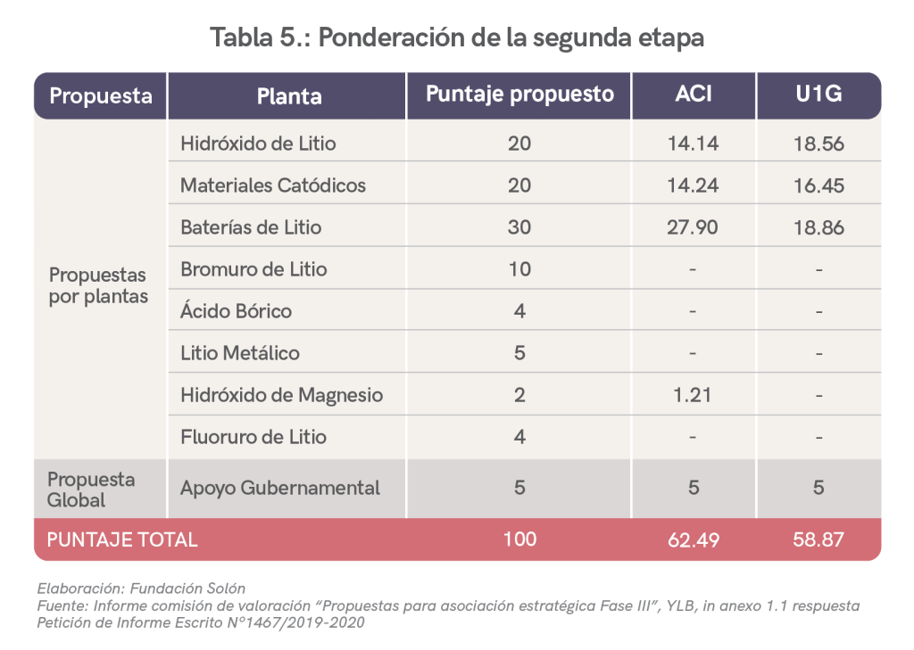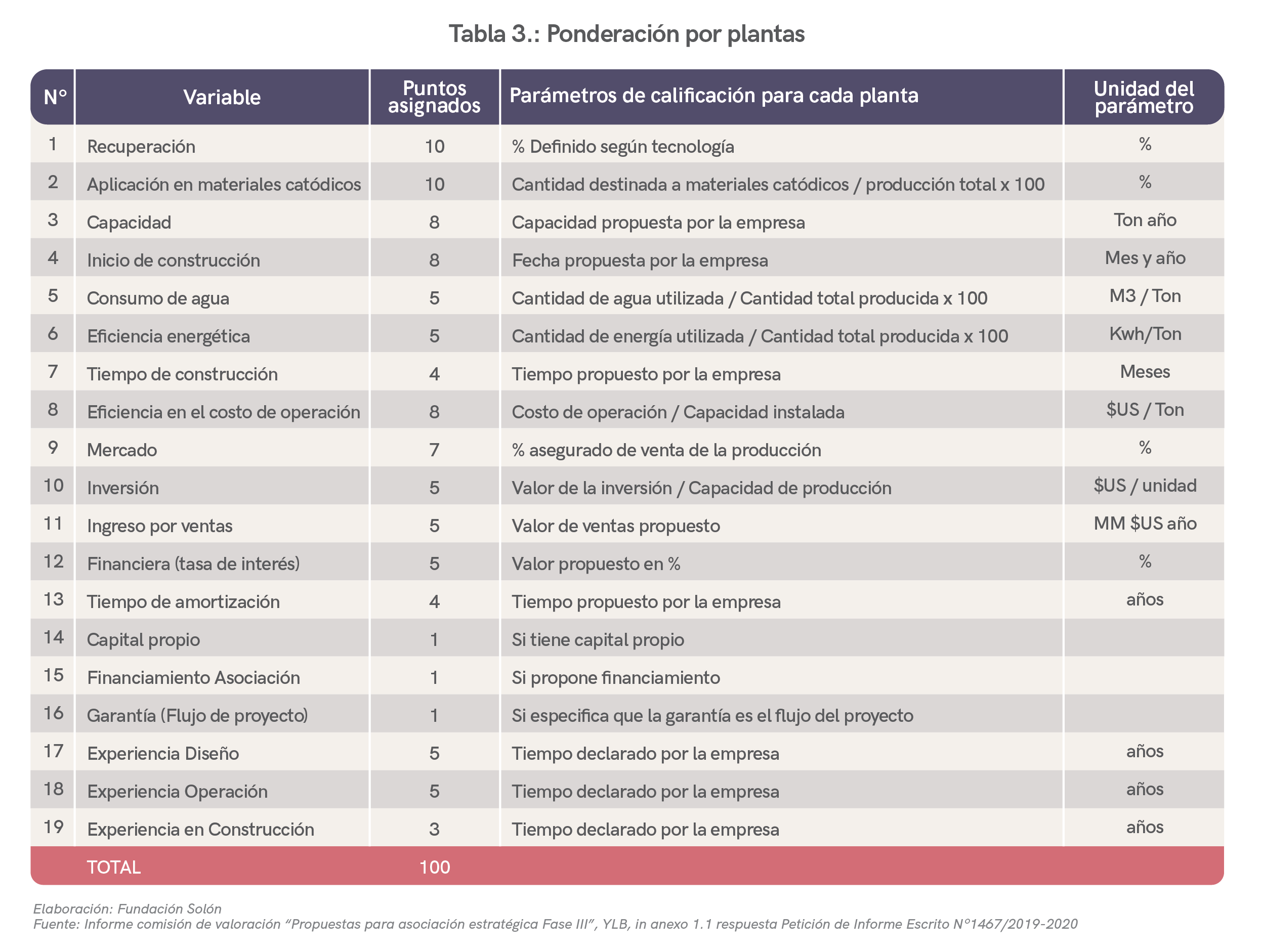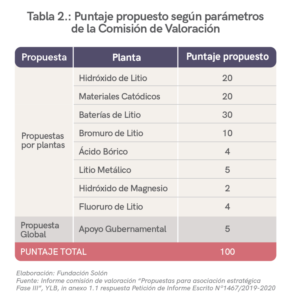 La Comisión de Valoración de “Propuestas para la Asociación Estratégica Fase III” con la empresa estatal del litio YLB, definió diferentes parámetros de evaluación para seleccionar a la socia estratégica. La valoración se hizo a partir de considerar la instalación de ocho plantas a construirse en Bolivia en las que la empresa interesada podía presentar una propuesta. Las plantas con mayor puntaje en orden de importancia eran: la planta de Baterías de Litio (30 puntos), la planta de Materiales Catódicos (20 puntos) y la planta de Hidróxido de Litio (20 puntos), que en total sumaban 70 puntos (Tabla 2).