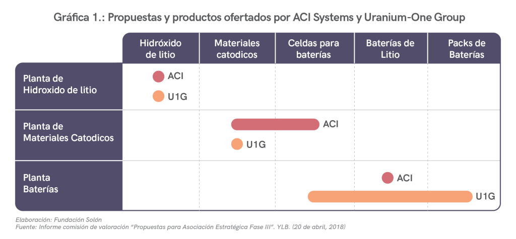 En relación a los materiales catódicos y las baterías de litio tampoco queda claro porqué el informe de la Comisión de Valoración no analizó en su conjunto ambas plantas para cada proponente, si ACI System había incluido la producción de celdas en su propuesta de materiales catódicos y U1G había incluido la elaboración de celdas en su propuesta de planta de baterías de litio. Además, U1G proponía llegar hasta packs de baterías de ion litio, mientras ACI Systems sólo planteaba alcanzar el ensamblado de baterías. En otras palabras, U1G iba más lejos en la cadena de valor de las baterías de litio.