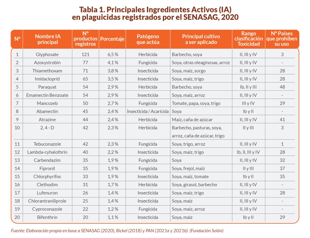 Al respecto -por medio de un balance con la Lista de Plaguicidas Altamente Peligrosos (PAP) de la Red Internacional de Acción en Plaguicidas (PAN), la Lista internacional consolidada de plaguicidas prohibidas de la PAN, los registros de plaguicidas en la Unión Europea, y la Lista negra de plaguicidas autorizados en la Unión Europea de Greenpeace– Bickel (2018) reveló que el 72% de los 229 IA que contaban con un registro sanitario del Senasag en el 2018 eran considerados problemáticos por su toxicidad.