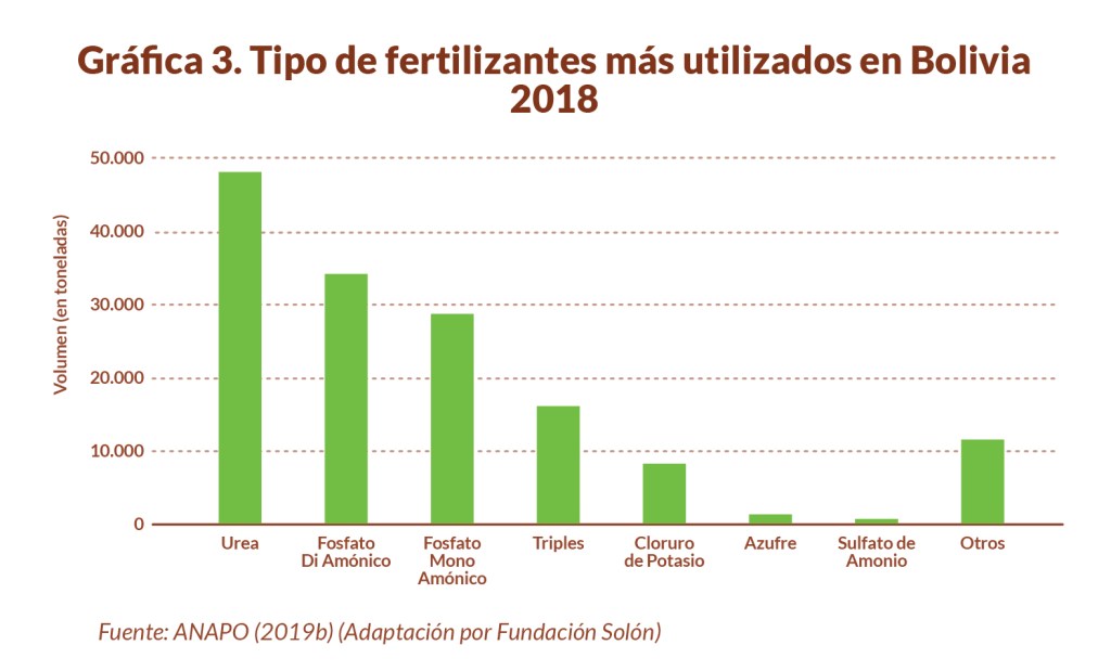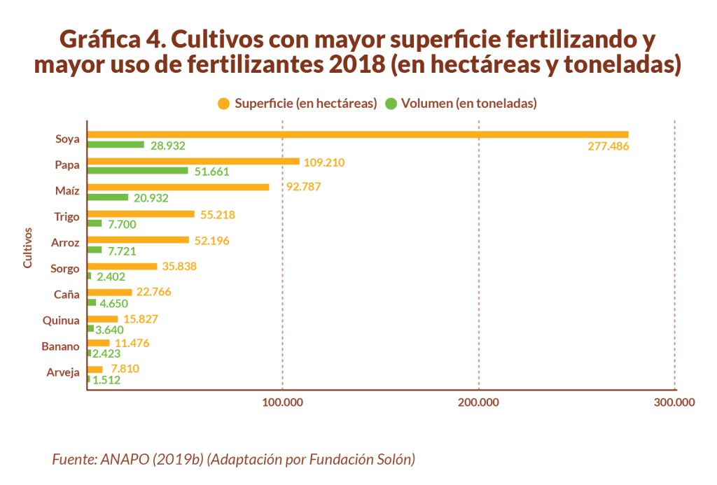 Los datos presentados por la ANAPO señalan que alrededor de 754.740 hectáreas fueron fertilizadas en 2018, equivalente al 20,17% del total de la superficie cultivada en Bolivia de ese año. Siendo la soya el cultivo con más superficie fertilizada, con 277.486 hectáreas, seguido luego por la papa y el maíz, con 109.210 y 92.787 hectáreas respectivamente. Sin embargo, es de notar que la papa fue el cultivo que más fertilizantes consumió en el mismo periodo, con el 39,3% del total; seguido de la soya (22%), el maíz (15,9%), el arroz (5,9%) y la caña (3,5%) como los cultivos que tuvieron mayor consumo de estos fertilizantes (Gráfica 4) (ANAPO, 2019b).