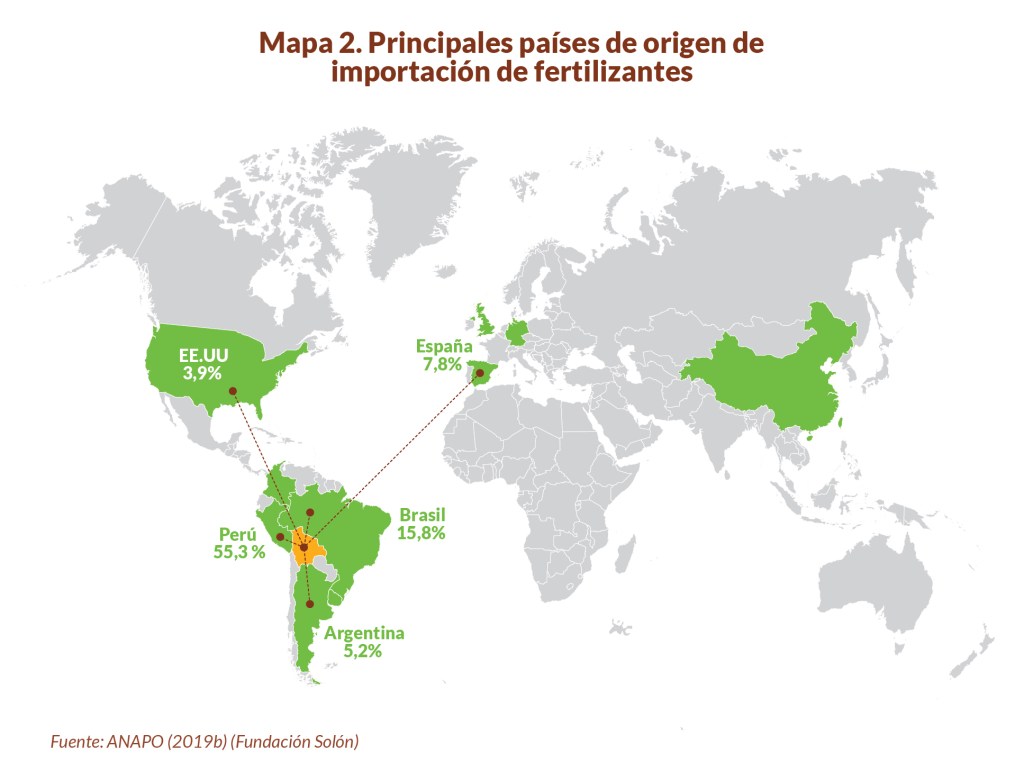 Al igual que con los plaguicidas, Bolivia depende ampliamente de la importación de fertilizantes; los mismos que entran al país tanto por la vía legal como por el contrabando (ANAPO 2019b). La amplia mayoría de los fertilizantes introducidos lícitamente al país durante 2018 provinieron de Perú, representando el 55,3% del total importado legalmente. Si bien la mayoría de los fertilizantes que se consumen en el país provienen del Perú, según la ANAPO este país sería considerado como uno de tránsito de los fertilizantes que provienen desde China (ANAPO, 2019b). Después de Perú, los fertilizantes importados provienen de Brasil (15,8%), España (7,8%), Argentina (5,2%) y EE.UU. (3,9%), entre otros países (Mapa 2).