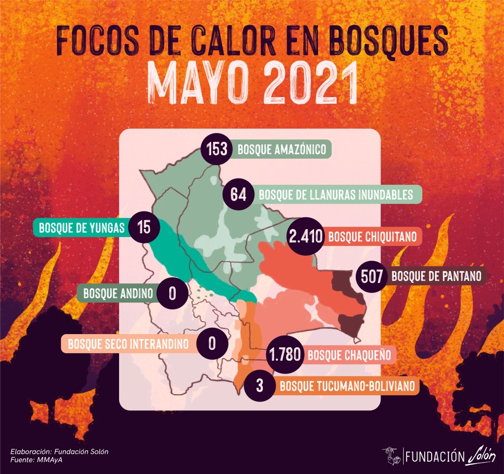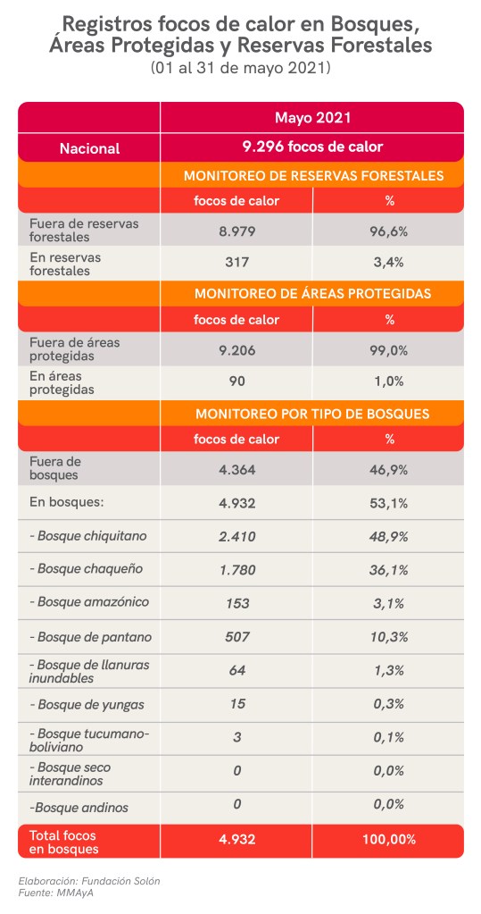 El mes de mayo de 2021 registró 9.296 focos de calor en todo el territorio nacional, según datos proporcionados por el Sistema de Información y Monitoreo de Bosques (SIMB) del Ministerio de Medio Ambiente y Agua (MAAyA). Esto significa un incremento del 47,7% en relación a los focos de calor registrados en mayo 2020 y mayo 2019, fechas en las cuales se contabilizaron 6.294 y 6.297 focos de calor respectivamente.
