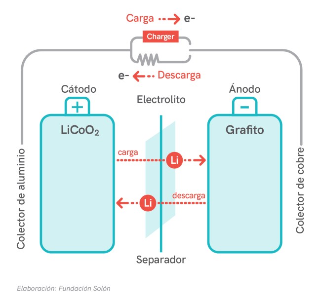 Cuando una batería se carga los iones fluyen del cátodo al ánodo, cuando ésta se descarga viajan del electrodo negativo al electrodo positivo. Cuando todos los iones de litio se han desplazado al cátodo la batería está completamente descargada. De manera inversa cuando todos los iones de litio se han desplazado al ánodo la batería está totalmente cargada.