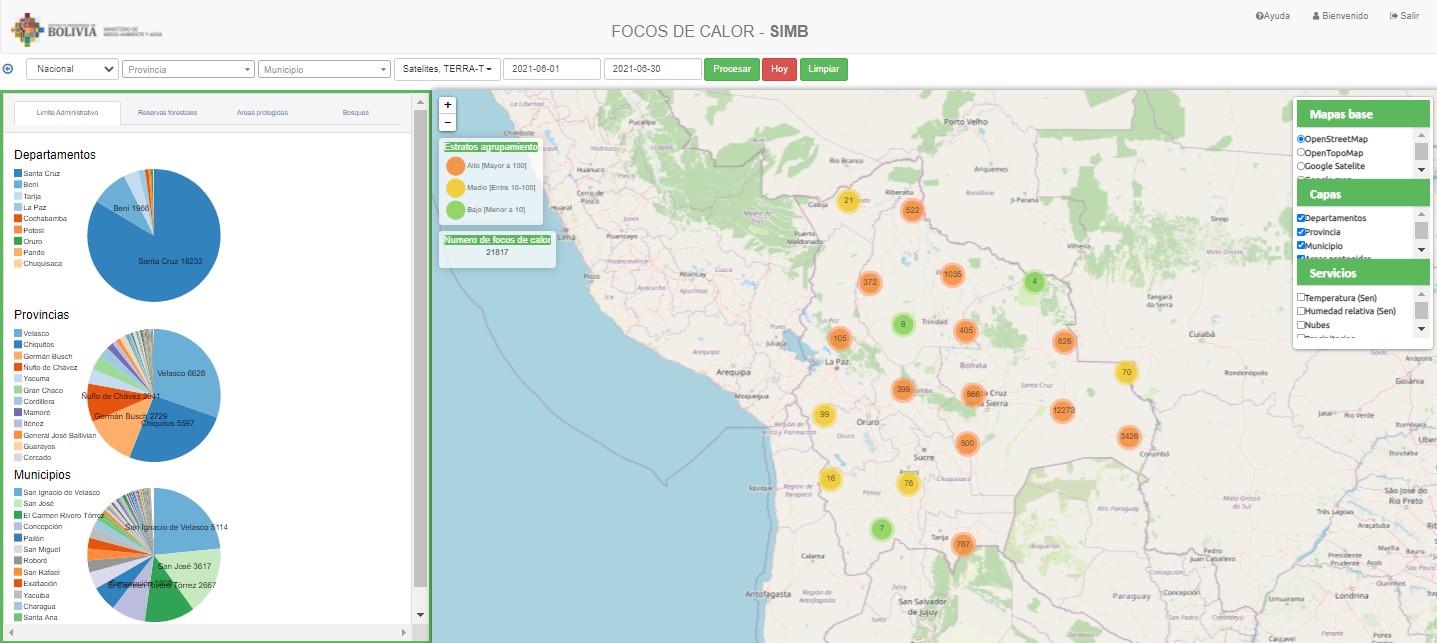 Solamente durante el mes de junio de 2021 el Sistema de Información y Monitoreo de Bosques (SIMB) del Ministerio de Medio Ambiente y Agua (MMAyA) registró 21.817 focos de calor. Esto significa 2,9 veces más que junio de 2020 (cuando se registraron 7.315 focos) y 1,7 veces más que junio de 2019 (12.678 focos). De hecho, el mes de junio de 2021 registró la mayor cantidad de focos de calor de los últimos 10 años.