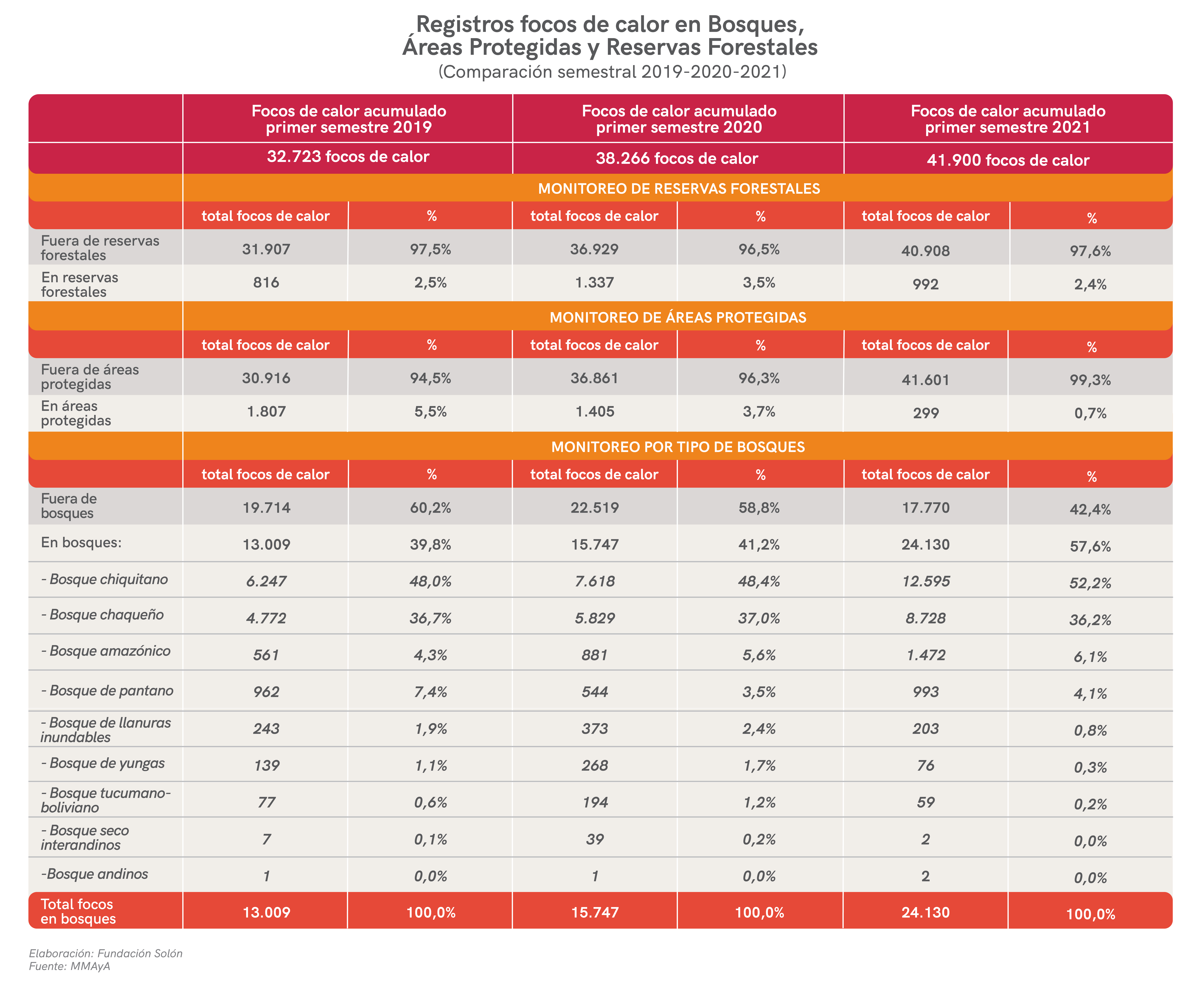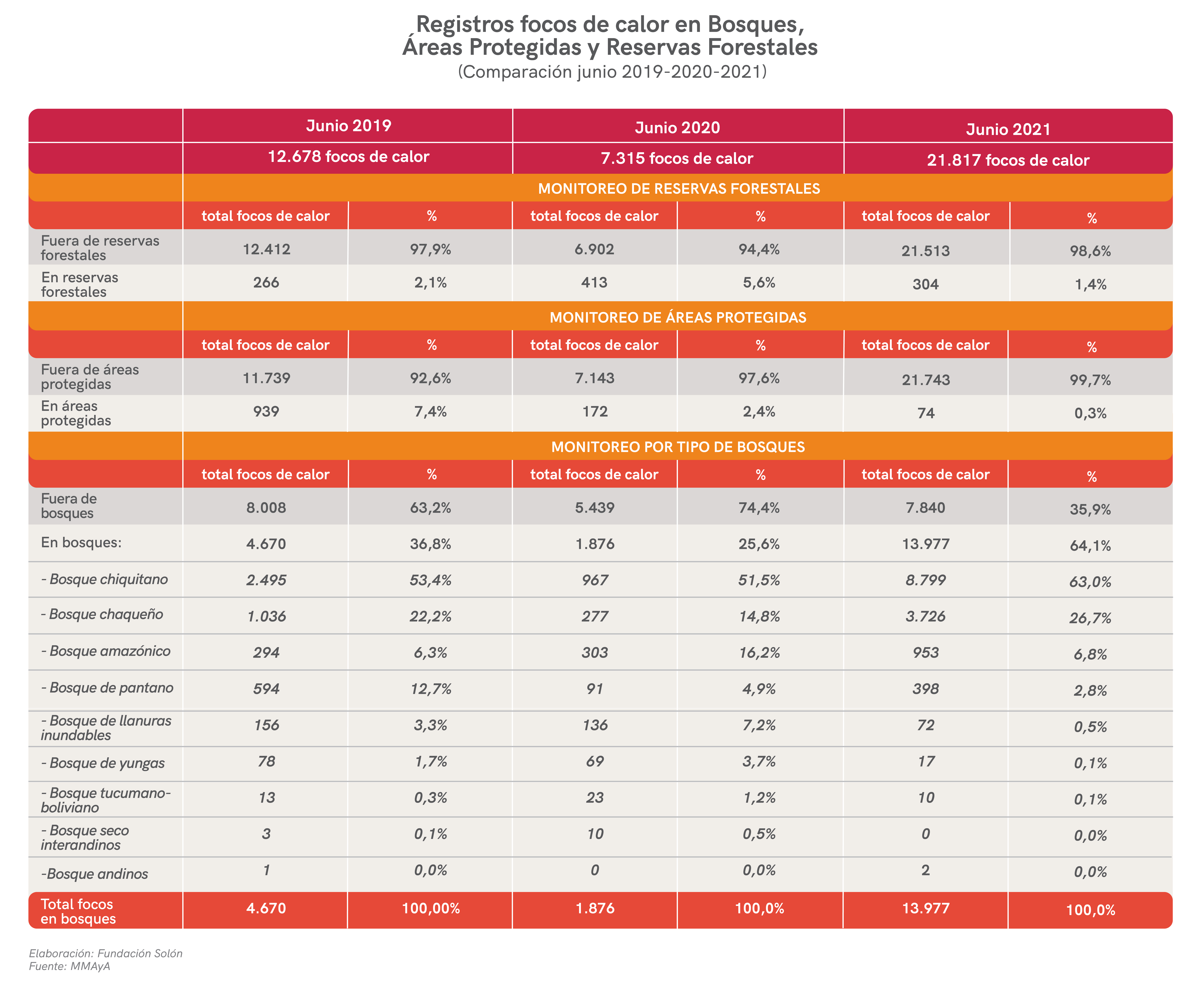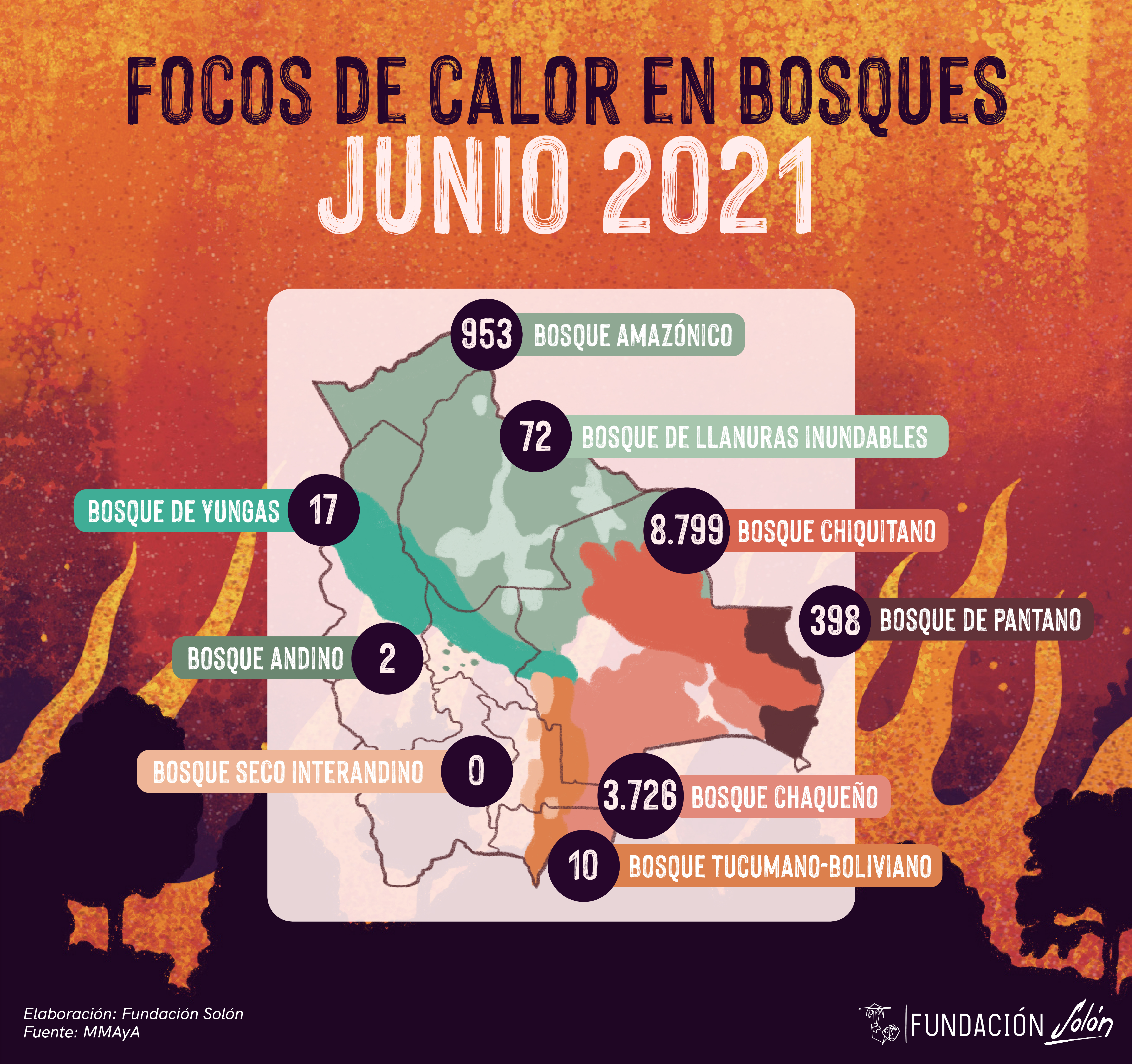 Solo durante junio de 2021 se registraron 8.799 focos de calor en el bosque chiquitano, representando el 63% del total de focos de calor registrados en áreas boscosas durante ese mes. Esto significa un aumento del 809% en relación a los focos registrados en el bosque chiquitano en junio del 2020 y 252% más que en junio del 2019. Mientras que en el bosque chaqueño se registraron 3.726 focos de calor (equivalente al 26.7% del total de focos de calor en áreas boscosa). En otras palabras, durante junio del 2021 el bosque chaqueño registró 13,4 veces más focos de calor que junio del 2020 y 3,6 veces más que en junio del 2019.
