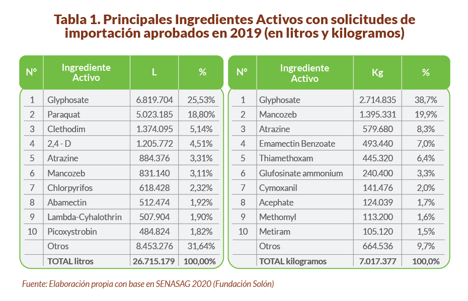 Tras el glifosato, los demás ingredientes activos con mayores solicitudes de importación aprobado por el Senasag en ese año fueron: paraquat (5.023.185 L), clethodim (1.374.095 L), mancozeb (1.395.331 kg y 831.140 L), 2,4-D (1.205.772 L), atrazine (884.376 L y 579.680 kg), chlorpyrifos (618.428 L), emamectin Benzoate (493.440 kg) y thiamethoxam (445.320 kg), entre otros.[2] En conjunto, los diez ingredientes activos presentados en la tabla 1 representan el 68,3 % y 90,3 % de todas las solicitudes de importaciones aprobadas durante 2019 en litros y kilogramos respectivamente.