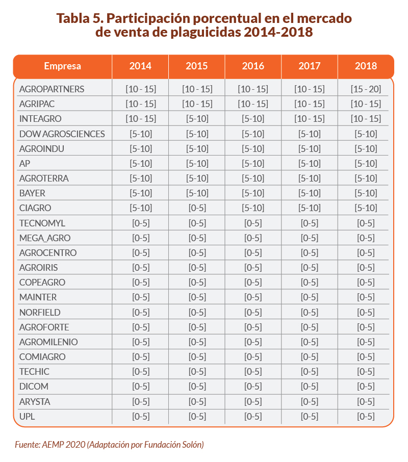 Sin embargo, no menos importantes son las importadoras y/o comercializadoras nacionales, tales como: Agropartners S.R.L., Agroindu Group S.A., Agroterra S.R.L., AP Agricultura Protegida S.R.L., Mega Agro LTDA., Agromilenio S.R.L., Agroforte S.R.L., entre varias otras. Estas empresas nacionales tienen un gran peso en el abastecimiento del mercado nacional. Un estudio llevado a cabo por la Autoridad de Fiscalización de Empresas (AEMP) revela que para el año 2018 varias empresas nacionales poseían una importante participación en el mercado nacional de plaguicidas, llegando a representar entre el 15 % a 20 % de la cuota del mercado de ese año, como en el caso de Agropartners S.R.L. (Tabla 5).