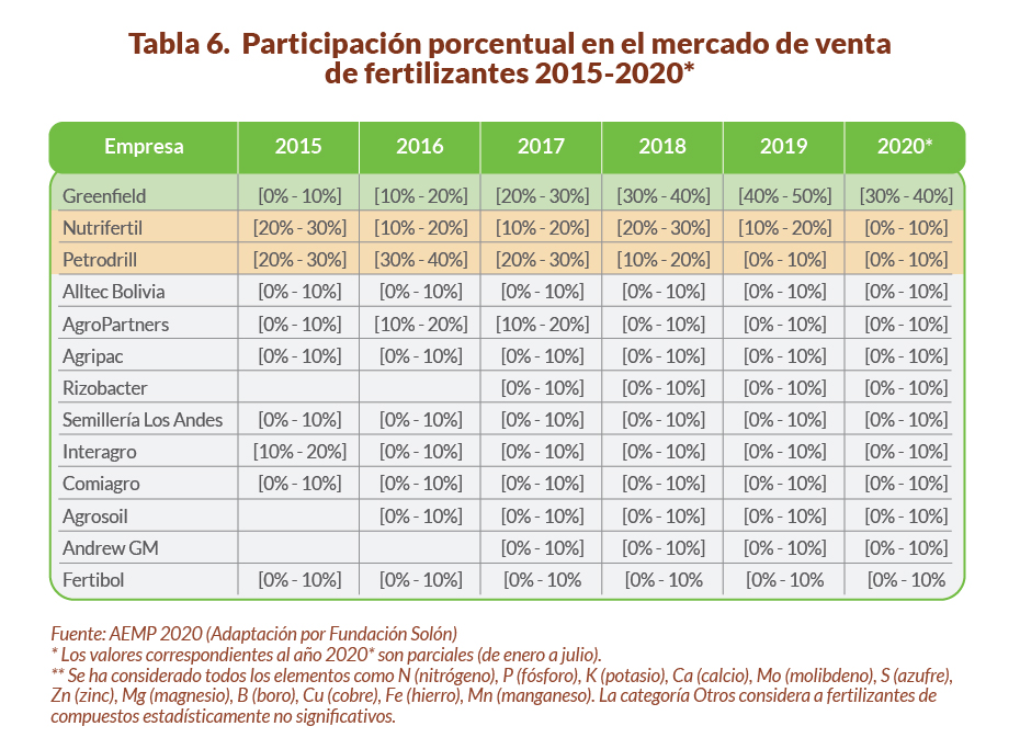 De acuerdo a un estudio de mercado elaborado por la AEMP (2020), la empresa Greenfield poseía la mayor participación porcentual en el valor de venta de fertilizantes, concentrando hasta el 50% de la cuota del mercado en 2019. Seguidamente, se ubica la empresa Nutrifertil con una cuota de mercado de hasta 20 % y la empresas Petrodrill con una cuota del 10 % en las ventas de fertilizantes en el año 2019 (Tabla 6).
