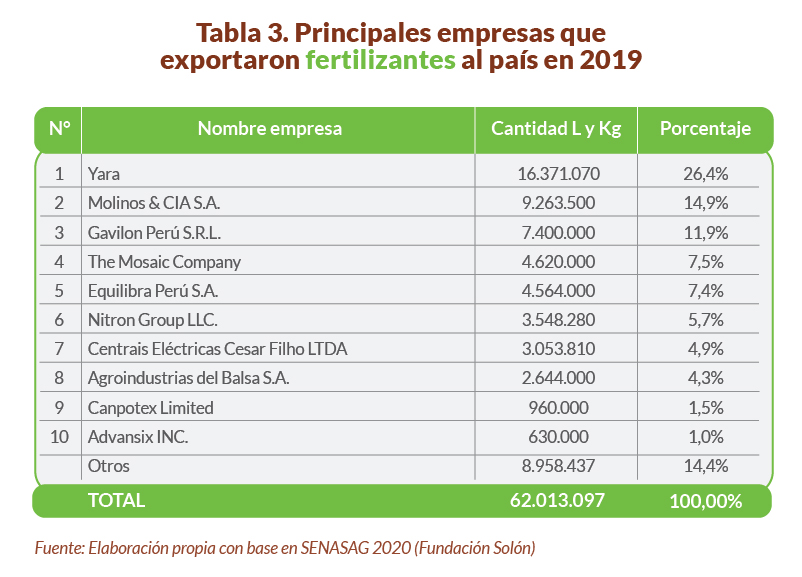 Existe una amplia variedad de empresas exportadoras de fertilizantes (238 solo en 2019). De estas empresas, sobresale la multinacional noruega Yara, la cual -mediante su filial peruana- aglutinó el 26 % de las solicitudes de importaciones de fertilizantes. En segundo lugar se ubica la empresa peruana Molinos & CIA S.A. (del grupo Molicom) con el 14,9 % y en tercer lugar Gavilon Perú S.R.L. con el 11,9 %. Estas tres empresas aglutinan más de la mitad de las solicitudes de importación de fertilizantes durante 2019. En la tabla 3 se aprecia las diez empresas -peruanas, brasileñas, mexicanas, estadounidenses y canadienses- que en conjunto concentran el 85,6 % del volumen de las solicitudes de importación de fertilizantes aprobadas por el Senasag en 2019.
