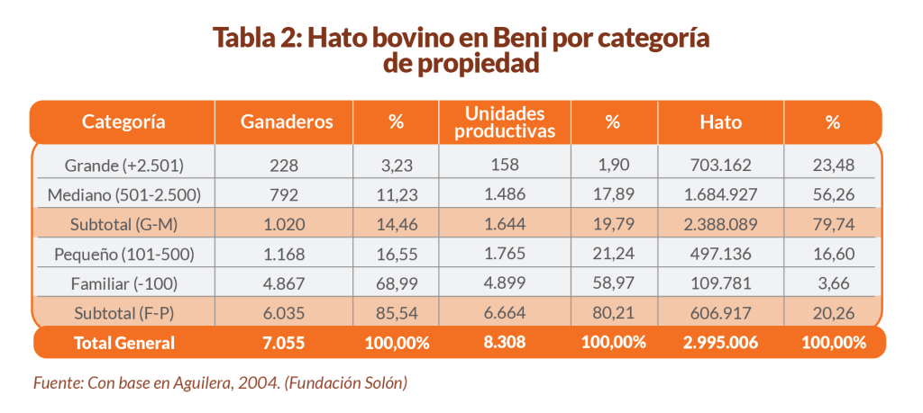 La concentración de propiedad de ganado parece ser más acentuada en Beni, pues el 14,46 % que constituyen los productores grandes y medianos concentran el 80 % del hato ganadero (2.388.089). En tanto que el 20 % del hato (606.917) está en manos de pequeños productores y de núcleos familiares que hacen el 85 % del total de productores ganaderos benianos, según datos de Aguilera (2004). En este caso, hay que subrayar que el grueso de la población ganadera está en la categoría de “familiar” -este segmento comúnmente es campesino o indígena-, y lo componen 4.867 productores (70 %) que apenas poseen el 3,7 % de todo el hato ganadero departamental (109.781), lo que representaría una tenencia de 22 vacas por familia. La categoría de pequeños productores tendría una correlación de 426 cabezas por propietario; mientras los medianos ganaderos -que hacen el 11 %- concentran el 56 % del hato departamental, lo que representaría una tenencia de 2.127 vacas por propietario y los grandes ganaderos tienen una correlación de 3.084 vacas por propietario, sin embargo una tenencia por debajo de los grandes propietarios cruceños.