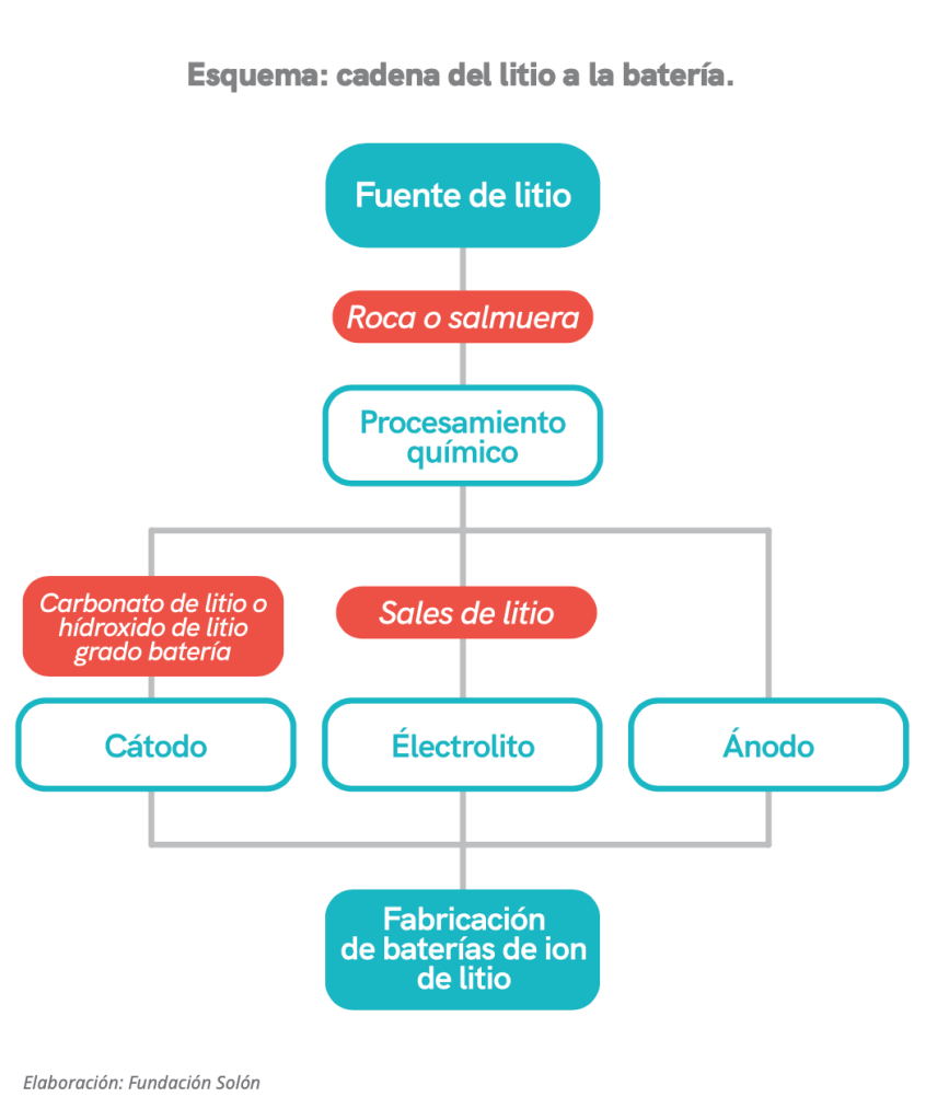 El litio se encuentra inmerso en diversas cadenas de valor con características diferentes. La cadena de valor de grasas, cerámicas, vidrios, baterías y todos aquellos productos que utilizan el litio para su producción. Sin embargo, en el siglo XXI, la cadena de valor de mayor importancia para el metal mas ligero del mundo es la de las baterías para la fabricación de vehículos eléctricos. La importancia de la cadena de valor de los vehículos eléctricos se da por un crecimiento en los últimos años y proyecciones potenciales hacia el futuro, de forma paralela se han dado recientes procesos de regulación para la transición energética, necesaria para combatir los efectos del cambio climático, que impulsan esta cadena de valor y así la producción de vehículos electricos.