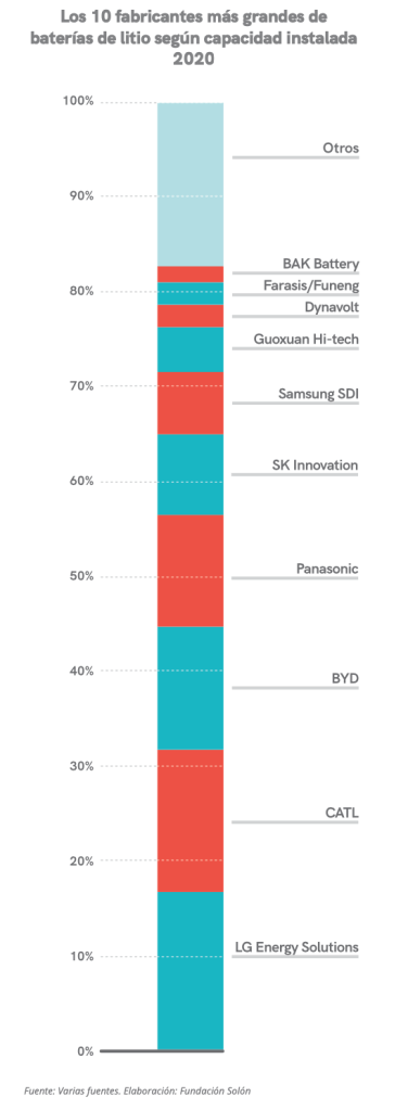 En 2020, el mayor fabricante de celdas de baterías de litio, según su capacidad instalada, era LG Energy Solution de Corea del Sur, subsidiaria independiente de LG Chem. Esta compañía cuenta con 5 plantas con una capacidad instalada total de 81 GWh y suministra baterías de litio a Fiat Chrysler Automobiles (FCA), Ford, Geely, General Motors, Hyundai, Jaguar, Renault- Nissan-Mitsubishi (RNM), Tesla, VW y Volvo. En segundo y tercer lugar se encuentran las compañías chinas CATL y BYD con capacidades instaladas de 72 GWh y 62 GWh. Estas empresas chinas suministran baterías de litio a varias empresas chinas y a empresas de otros países como BMW, Toyota, RNM, VW y otras. En cuarto lugar, se encuentra Panasonic de Japón con 54 GWh de capacidad instalada. Panasonic tiene una alianza con Tesla de EE.UU. que involucraba la mitad de su producción en 2019. Panasonic junto a Tesla producirá baterías libres de cobalto en los próximos dos a tres años. Los principales fabricantes de baterías de litio se encuentran en Asia.