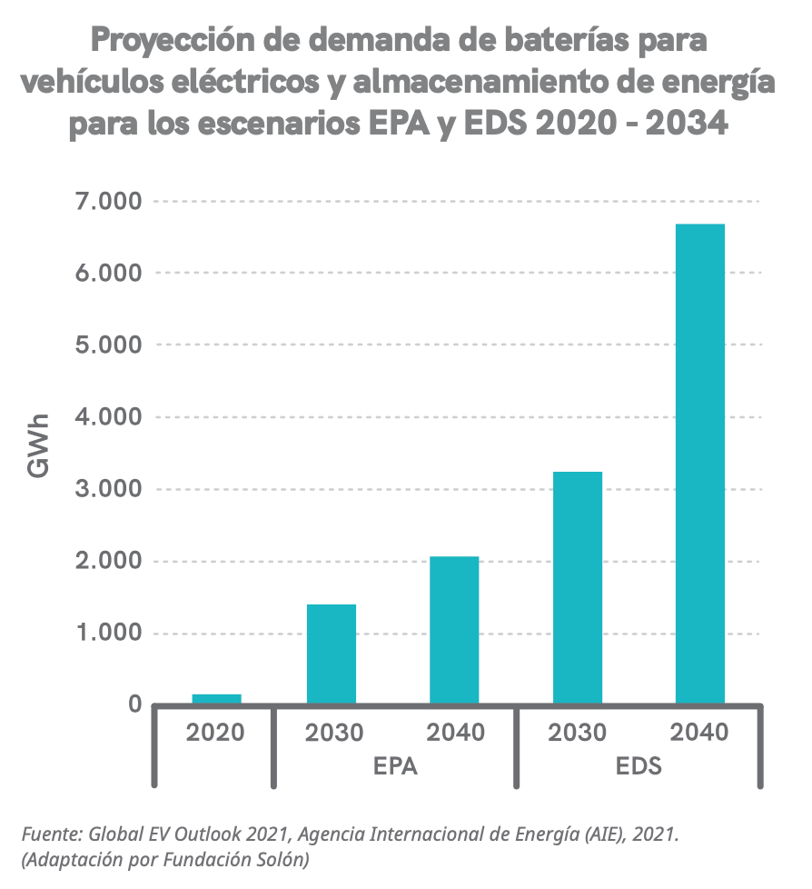 La AIE prevé que la demanda de baterías para vehículos eléctricos aumente significativamente durante la próxima década, alcanzando 1,6 TWh (tera vatios por hora) para el 2030 en su Escenario de Políticas Actuales (EPA). En su Escenario de Desarrollo Sostenible (EDS), la AIE estima que esa cifra se puede duplicar y llegar a los 3,2 TWh. El Escenario de Desarrollo Sostenible de la AIE considera la implementación de políticas más ambiciosas para la reducción de gases de efecto invernadero. La AIE estima que durante la presente década la mayor demanda seguirá en la China, seguida de Europa y Estados Unidos.