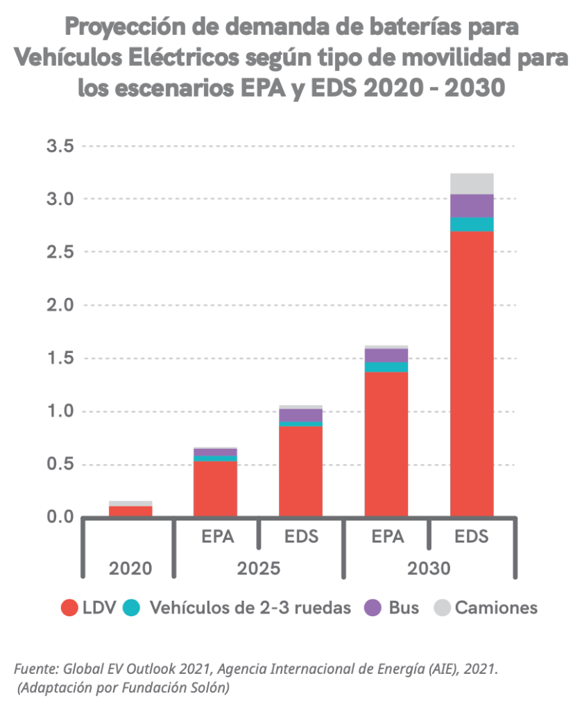 A nivel de tipos de vehículos eléctricos, la AIE proyecta que los vehículos eléctricos ligeros (LDV por sus siglas en ingles) representarán el 85% de la demanda de baterías de litio para movilidades eléctricas, seguidas de las movilidades de 2 a 3 ruedas, buses y camiones.