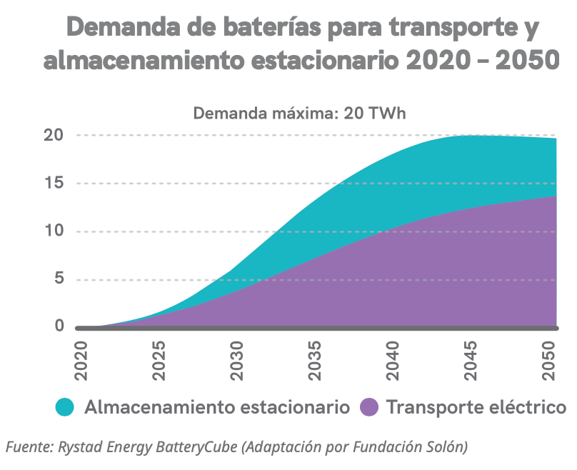 Si bien el sector de baterías para transporte (vehículos eléctricos de diferente tamaño y características, marítimo y aviación) es el primer en crecer, a partir de mediados de la presente década Rystad estima que comenzará a crecer también la demanda de baterías estacionarias para la alimentación de edificaciones y redes eléctricas. Sumando toda la demanda de transportes eléctricos y baterías estacionarias, Rystad estima que para el 2045 se alcanzaría el pico de 20 TWh de producción anual de baterías de litio para todos estos usos. En esta proyección Rystad estima que 5 TWh de baterías de vehículos eléctricos se estarían reciclando para baterías de almacenamiento estacionario.