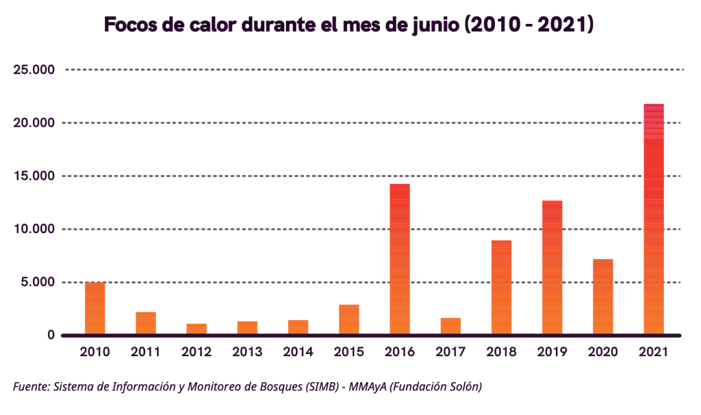 Los focos de calor durante junio de 2021 no sólo señalan un aumento significativo en comparación a los meses anteriores, sino que son muy superiores en contraste a los registros históricos de las anteriores gestiones. Los 21.817 focos de calor registrados en junio de este año, por ejemplo, son 3 veces más que los registrados durante el mismo mes en 2020 (7.315 focos) y 1,7 veces más que junio de 2019 (12.678 focos). De hecho, el mes de junio de 2021 registró la mayor cantidad de focos de calor de los últimos diez años.