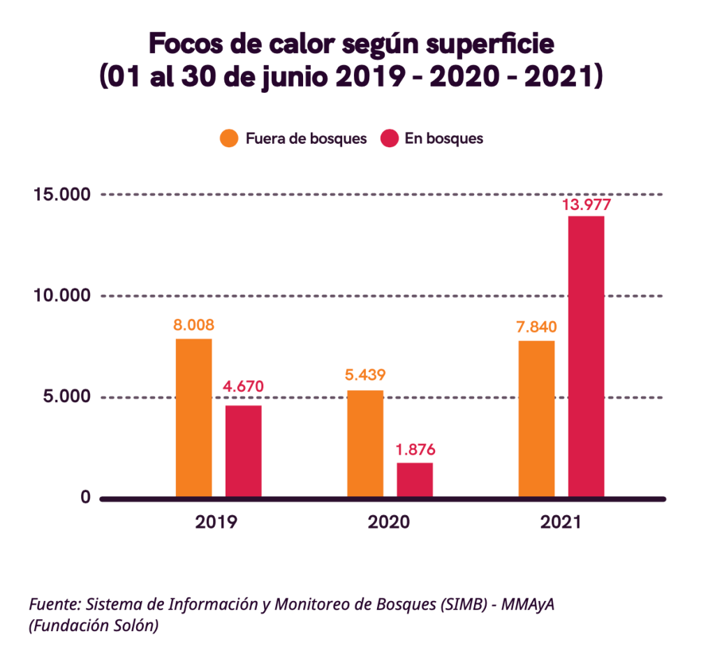 El mes de junio de 2021 fue particularmente aciago para los bosques en Bolivia. Solo durante ese mes se registraron 13.977 focos de calor en áreas con cobertura boscosa, equivalente al 64,1 % de todos los focos de calor contabilizados durante ese mes. Esto significa un aumento considerable si se lo compara con años anteriores. La cantidad de focos de calor registrados en bosques durante junio de 2021 representa 7,4 veces más que los que se registraron en 2020 -1.876 focos en bosques, equivalente al 25,6 % del total- y casi 3 veces más que en junio de 2019 -4.670 focos en áreas boscosas, igual al 36,8 % del total.
