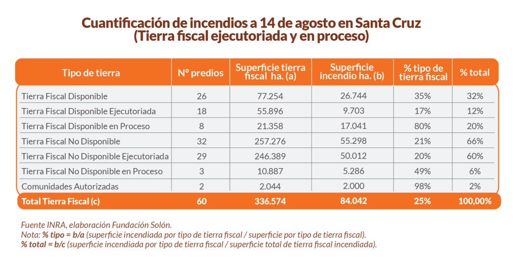 [3] El INRA incluye dentro de las tierras fiscales ejecutoriadas a las “comunidades autorizadas” que fueron responsables de 2.000 hectáreas incendiadas hasta el 14 de agosto. Excluyendo a este sector las tierras fiscales ejecutoriadas quemadas suman 59.715 hectáreas.