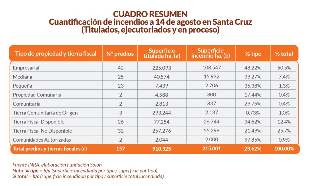 Los pequeños propietarios, con menos de 50 hectáreas, serían responsables de sólo el 2,5% de los incendios en predios titulados y del 0,5% en predios en proceso de titulación, según los datos del INRA. Mientras las propiedades empresariales tituladas y en proceso han incendiado una superficie de 108.547 hectáreas, las medianas propiedades han quemado 15.932 hectáreas y las pequeñas propiedades 2.706 hectáreas. Las pequeñas propiedades contribuyen con menos del 2% de las hectáreas incendiadas, sin embargo, con relación a su superficie dotada o en proceso de dotación, aquellas identificadas por el INRA, quemaron un 36% de su tierra.