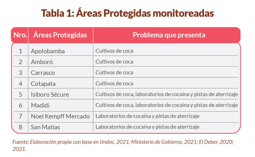 Según el último monitoreo de la Oficina contra las drogas y el delito de Naciones Unidas (Unodc por sus siglas en inglés) el incremento de cultivos compromete a los parques: Isiboro Sécure (Beni-Cochabamba), Carrasco (Cochabamba), Madidi (La Paz), Apolobamba (La Paz), Cotapata (La Paz) y Ámboro (Santa Cruz). Mientras que reportes del Ministerio de Gobierno denuncian el aumento de presencia de campamentos con megalaboratorios de cocaína y pistas de aterrizaje para transporte de droga en los parques Noel Kempff Mercado y San Matías, ambos en Santa Cruz.