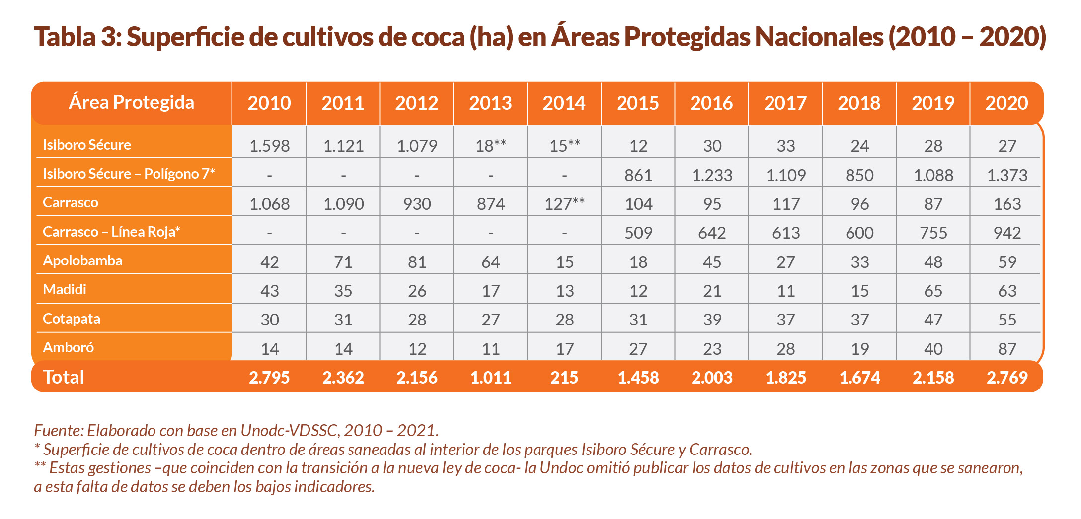 Las Áreas Protegidas con los registros históricos más altos de cultivos de hoja de coca son el Parque Nacional Isiboro Sécure (PNIS) –también conocido como Territorio Indígena y Parque Nacional Isiboro Sécure (TIPNIS)- y el Parque Nacional Carrasco (PNC). El primer monitoreo público de cultivos de coca por parte de la Unodc de 2003 reportó la existencia de 1.605 ha de coca en el Isiboro Sécure y 778 ha de coca en el Carrasco; la suma de ambas áreas representaba el 33 % del total de coca cultivada en la provincia Chapare (7.300 ha), lo que en ese momento era significativo y alarmante. En 2020, la suma del total de cultivos de coca en ambos parques nacionales suma 2.505 ha, lo que representaría el 32,5 % del total de coca permitida en el Chapare (7.700 ha) y el 26,1 % del total de coca cultivada en Chapare en 2020: 10.606 ha de las que 2.906 son excedentarias.