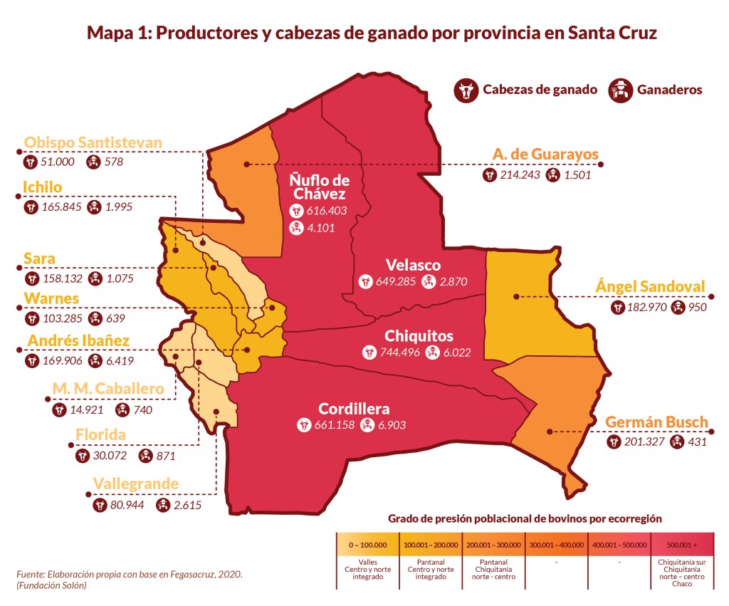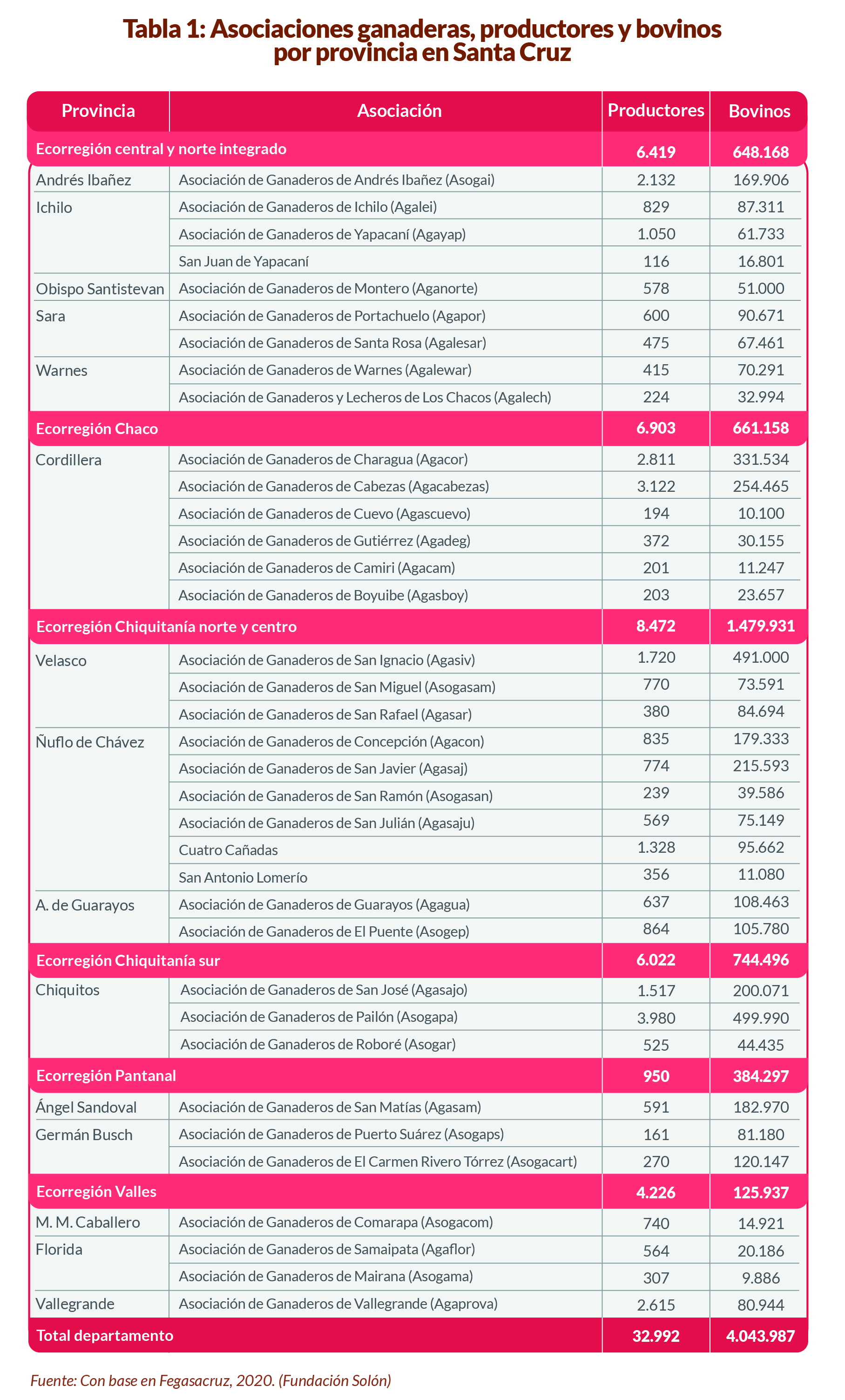 Es importante hacer un acercamiento a la correlación entre productores y hato ganadero en algunos municipios, pues es evidente en el caso de la Chiquitanía que la Asociación de Ganaderos de San Ignacio de Velasco (que tiene 1.720 asociados) y la Asociación de Ganaderos de Pailón (que tiene 3.980 asociados) cuentan con el mayor hato de ganado de la región, llegando juntos a las 990.990 cabezas de ganado, casi un millón concentrado en dos municipios, subrayando que la correlación entre tenencia y hato hace que el caso de San Ignacio sea más llamativo. Otra asociación con alta concentración de hato es la de provincia Cordillera: la Asociación de Ganaderos de Charagua (Agacor) con 331.534; le sigue Asociación de Ganaderos de Cabezas (Agacabezas) con 254.465. El siguiente lugar lo ocupa la Asociación de Ganaderos de Carmen Rivero con 120.147 cabezas de ganado y que cuenta con 270 propietarios; le sigue la provincia Ángel Sandoval con la Asociación de Ganaderos de San Matías (con 591 afiliados) que cuenta con 182.970; después las Asociaciones de ganaderos chiquitanos como Concepción con 179.333 bovinos; Guarayos con 108.463; El Puente con 105.780, finalmente la provincia Andrés Ibañez que entre sus asociados llegan a abarcar un hato de 169.906 cabezas de ganado. De lejos se encuentran las restantes 24 asociaciones con menos de cien mil cabezas de ganado, lo que equivale a decir que el hato está concentrado en 12 asociaciones con más de cien mil cabezas de ganado cada una, de las que dos asociaciones asentadas en la ecorregión chiquitana concentran casi un millón de bovinos, lo que demuestra un alto nivel extractivo y al mismo tiempo una excesiva carga animal para al menos cuatro provincias cruceñas: Ñuflo de Chávez, San Ignacio de Velasco, Chiquitos y Cordillera.