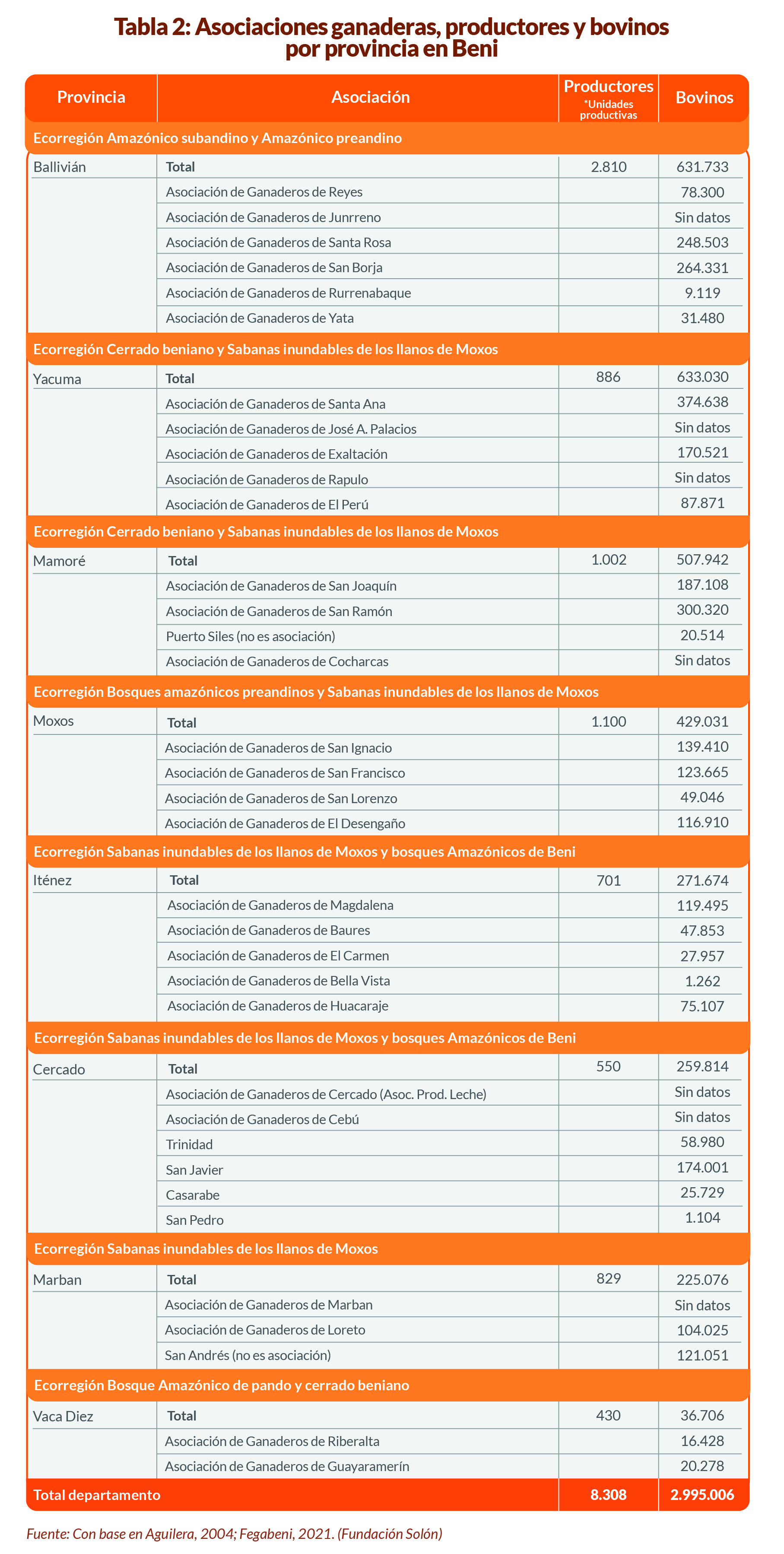 La Federación de Ganaderos de Beni (Fegabeni) fue creada durante un primer congreso de ganaderos de Beni y Pando el 20 de agosto de 1968. Algunos aspectos sobre su historia son que en 1970 fundó la Beneficiadora de Carne Sociedad Anónima (Becasa) para la comercialización de carne al interior del país y hasta 1985 negoció los precios del mercado interno de carne con el Estado para los centros mineros de la Corporación Minera de Bolivia (Comibol). En 1986, producto del Decreto Supremo 21060, y el consiguiente cierre de minas la producción cárnica de Beni entró en crisis (Fegabeni, 2021). Representa a 29 organizaciones ganaderas de ocho provincias. A continuación se hará una aproximación cuantitativa al sistema asociativo ganadero en Beni por provincia, ecorregión y hato.