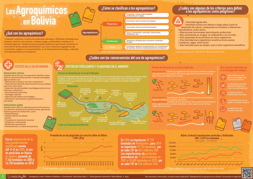 Durante las últimas décadas el uso de agroquímicos en el país fue en rápido aumento. La importación de fertilizantes, por ejemplo, pasó de 39.159 toneladas (t) en el 2006 a 79.732 t en el 2019. Mientras que las importaciones de pesticidas aumentaron de 11.365 t en 2001 a 52.489 t en 2019. Uno de los hitos fundamentales que explican este aumento fue la autorización de la soya genéticamente modificada evento (40-3-2) en el 2005. Desde entonces, el uso de pesticidas en Bolivia se duplicó, pasando de 7.146 t en 2005 a 14.758 t en 2018.