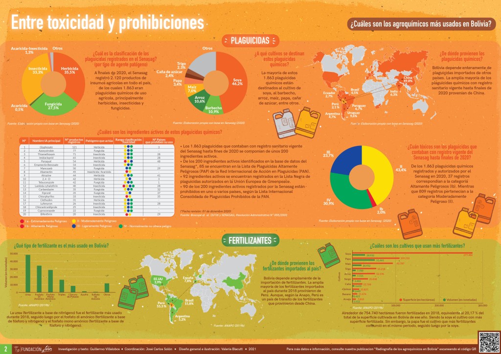 Hasta finales de 2020, el Senasag registró 2.120 productos de insumos agrícolas en todo el país, de los cuales 1.863 eran plaguicidas químicos de uso agrícola – principalmente herbicidas, insecticidas y fungicidas – destinados al cultivo de soya, al barbecho, arroz, maíz, papa, caña de azúcar, entre otros. La totalidad de estos plaguicidas químicos fueron importados de otros países, la amplia mayoría desde China.