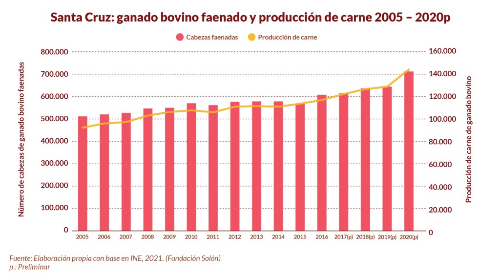 Los datos indican que sin lugar a dudas Santa Cruz es el único departamento que está generando el superávit de exportación, mucho más preciso es decir que de los más de 30 mil productores ganaderos cruceños, apenas 41 lograron cumplir los requisitos de exportación hasta 2020: de estos solo 1 es de Beni, el resto son estancias asentadas en Santa Cruz, y de estas estancias casi el 40 % cuenta con capitales extranjeros, sobre todo brasileños y argentinos (Méndez, 2021). De los 47 mataderos y frigoríficos registrados solo en Santa Cruz y Beni, tres cuentan con autorización para procesar la carne y exportarla: dos de estas empresas son cruceñas, patrimonio de familias ganaderas, y la tercera es una transnacional paraguaya con capitales brasileños asentada también en Santa Cruz.