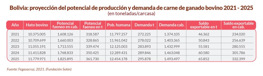Junto a los ganaderos, están las declaraciones del gobierno que en 2019 -en voz del entonces canciller Diego Pari- declaró las intenciones de exportar el excedente de 40 mil toneladas anuales (Fegasacruz, 2019). La línea base que abandera el sector ganadero para exigir la libre exportación y la apertura de más mercados internacionales, se unen a las proyecciones de 5 % de tasa de crecimiento que el sector ganadero cruceño busca a nivel nacional, cuando a nivel departamental lograron esta meta en 2020. En 2021 se tendría un saldo exportable de 46.362 mil toneladas, según las proyecciones de Fegasacruz, que vaticina un crecimiento sostenido de hato bovino a 2025 de 11.779.971 cabezas de ganado, lo que representaría 361.730 mil toneladas de carne procesada: 295.878 mil toneladas para el consumo interno y saldo exportable 65.852 toneladas de carne.