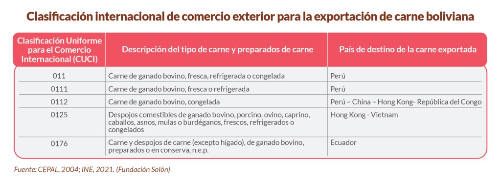De acuerdo a la clasificación internacional de comercio exterior, actualmente el país tiene cinco tipos de clasificación de las carnes bovinas que exporta a Perú, Ecuador, China, Hong Kong, República del Congo y Vietnam. Según los datos del INE, los países que cuentan con la mayor cantidad de toneladas exportadas son Perú, Ecuador y muy de lejos China como el más grande receptor de carne boliviana.