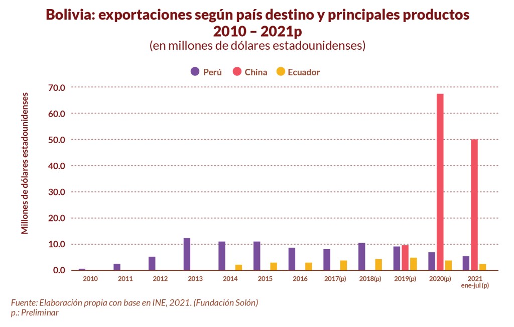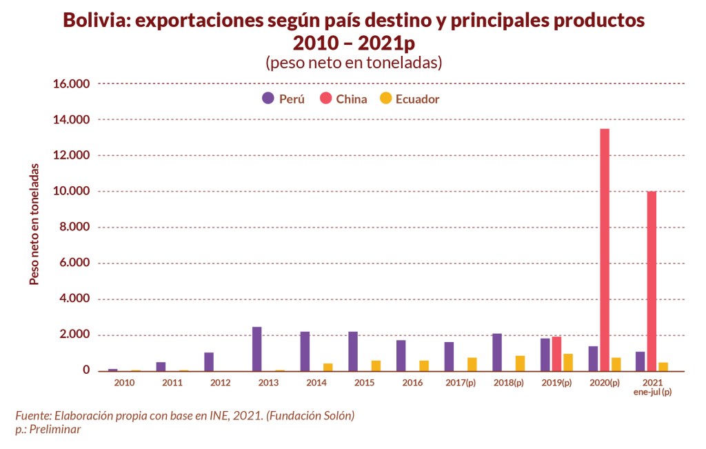 Las exportaciones a Perú y Ecuador redujeron en 2020, posiblemente producto de la pandemia. Sin embargo, en el caso peruano la tendencia de decrecimiento de 2019 se mantuvo en 2020: 2.125 toneladas en 2018 (10,4 millones de dólares), 1.879 toneladas en 2019 (8,9 millones de dólares) y 1.470 toneladas en 2020 (7,3 millones de dólares). En el caso chino, las exportaciones han ido creciendo significativamente, tomando en cuenta la primera exportación de 2019 que representó 1.972 toneladas (cantidad similar a las exportaciones de ese año a Perú y Ecuador) por un monto de 10,6 millones de dólares, en 2020 las exportaciones de carne a China llegaron a las 13.409 toneladas por un monto de 58,6 millones de dólares, lo que representó un incremento de casi 700 % respecto del primer envío. Los datos preliminares de 2021 del INE (enero a julio) indicaban que el sector ganadero estaba a punto de superar la cifra del año pasado, con 9.970 toneladas exportadas por un monto de 50,2 millones de dólares. En 2020, las exportaciones de carne a China representaron el 84 % del total de exportaciones de carne bovina a nivel nacional.