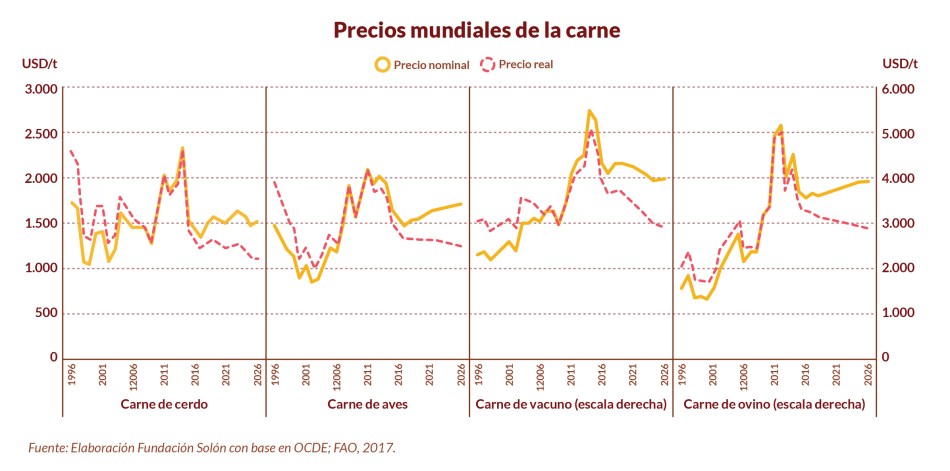 Por su parte, las proyecciones menos optimistas de la OCDE y la FAO apuntan a que brotes de enfermedades de animales y políticas comerciales definirán la dinámica de los mercados mundiales de carne: “La aplicación de diversos acuerdos comerciales, como el ya ratificado Tratado de Libre Comercio China-Australia (ChAFTA), o el Tratado de Libre Comercio Canadá-Ucrania (CUFTA) y el Acuerdo Económico y Comercial Global (AECG), ya suscritos, podrían ampliar y diversificar el comercio de carne durante el periodo de las perspectivas”.