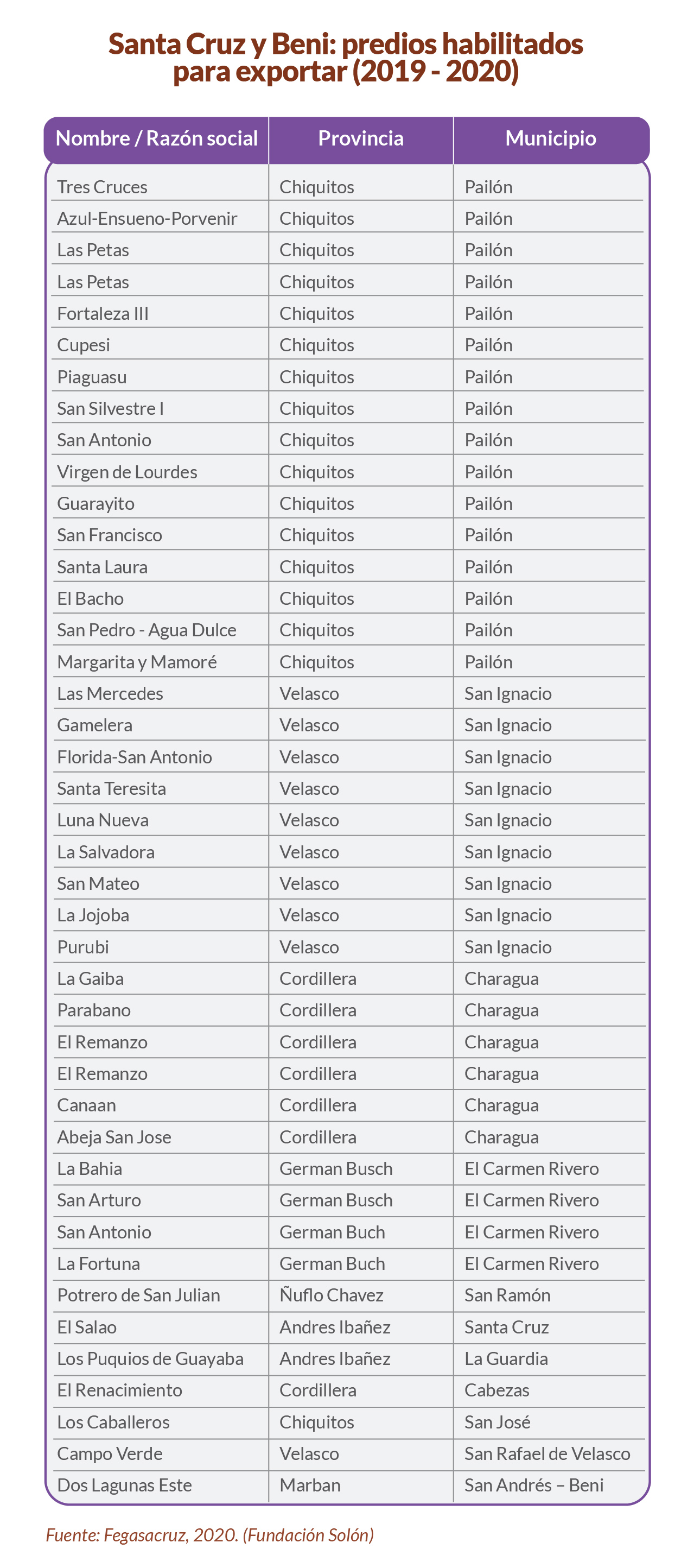 Los datos indican que sin lugar a dudas Santa Cruz es el único departamento que está generando el superávit de exportación, mucho más preciso es decir que de los más de 30 mil productores ganaderos cruceños, apenas 41 lograron cumplir los requisitos de exportación hasta 2020: de estos solo 1 es de Beni, el resto son estancias asentadas en Santa Cruz, y de estas estancias casi el 40 % cuenta con capitales extranjeros, sobre todo brasileños y argentinos (Méndez, 2021). De los 47 mataderos y frigoríficos registrados solo en Santa Cruz y Beni, tres cuentan con autorización para procesar la carne y exportarla: dos de estas empresas son cruceñas, patrimonio de familias ganaderas, y la tercera es una transnacional paraguaya con capitales brasileños asentada también en Santa Cruz.