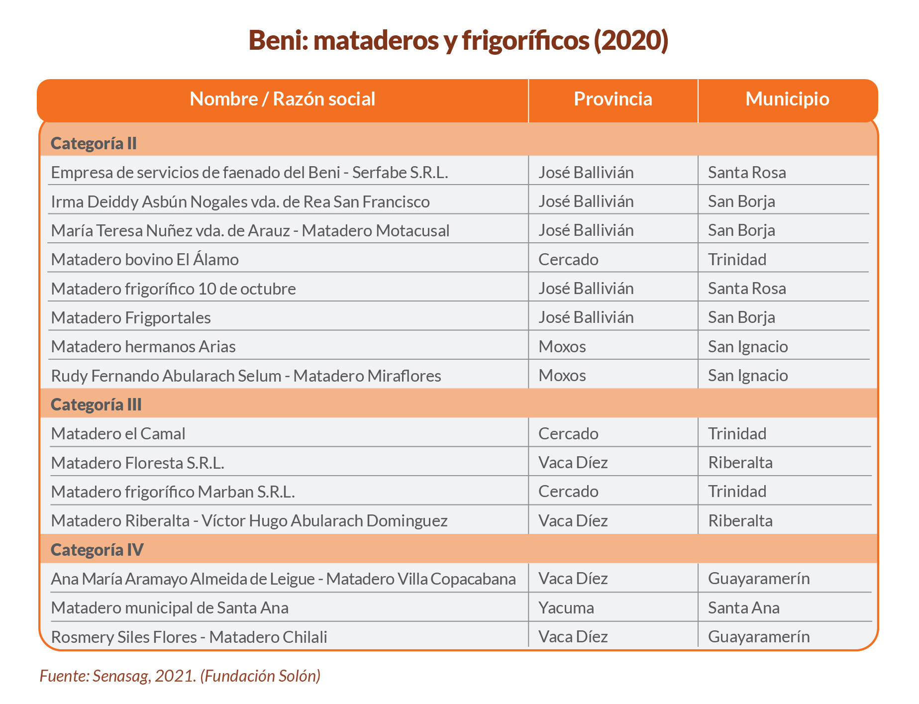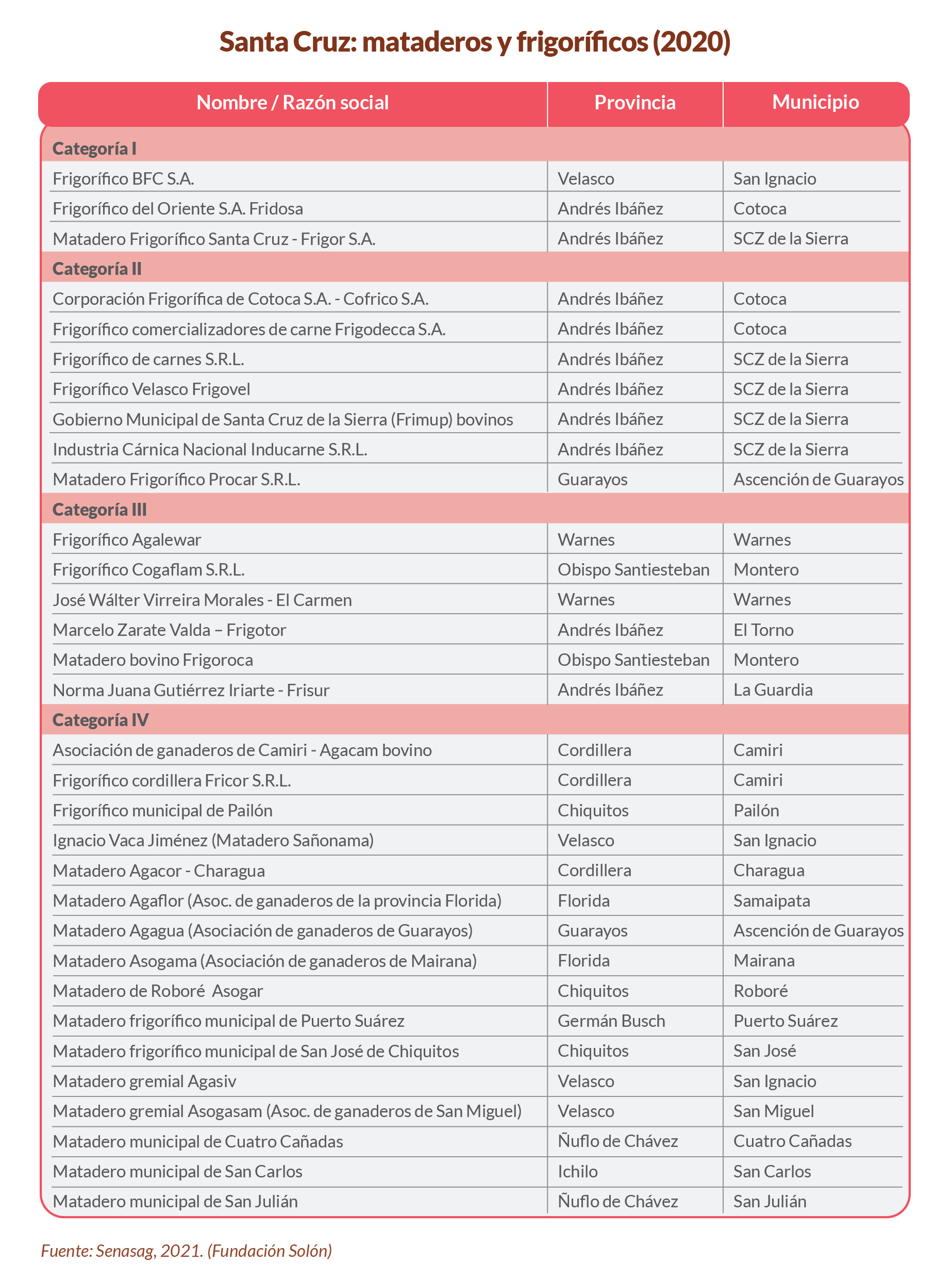 Los registros sobre frigoríficos y mataderos bovinos autorizados por Senasag se dividen en cuatro categorías: la cuarta categoría es la menos exigente para el mercado interno y la primera categoría es la cuenta con todos los requisitos para el mercado de exportación. En el caso de los departamentos de Beni y Santa Cruz, ambos suman 47 instalaciones frigoríficas: 32 ubicadas en Santa Cruz y 15 en Beni, la mayoría de estos mataderos pertenecen a las categorías II, III y IV, y de ahí provendrá casi toda la carne consumida a en esos departamentos y a nivel nacional.