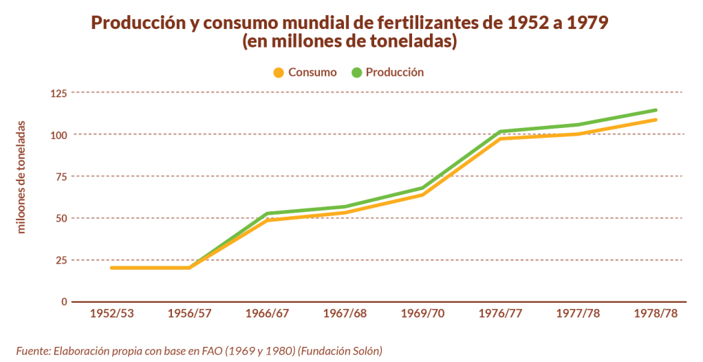 Es bajo el modelo de la Revolución Verde que la producción y consumo de insumos químicos fue proliferando en grandes partes del globo. La producción mundial de fertilizantes a base de combustibles fósiles, por ejemplo, pasó de promediar 20.8 millones de toneladas en 1952 a los 112.8 millones de toneladas en 1978. Mientras que el consumo mundial pasó de 20.2 millones de toneladas entre 1952/53 a 63 millones de toneladas para 1969/70 y a 107 millones de toneladas entre 1978/79 (FAO, 1969; FAO, 1979).