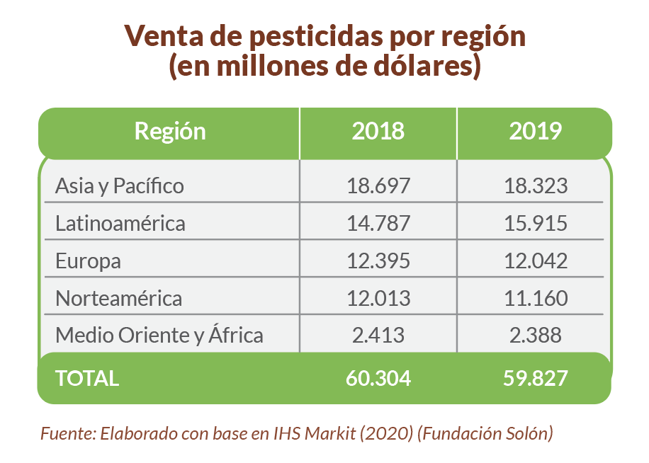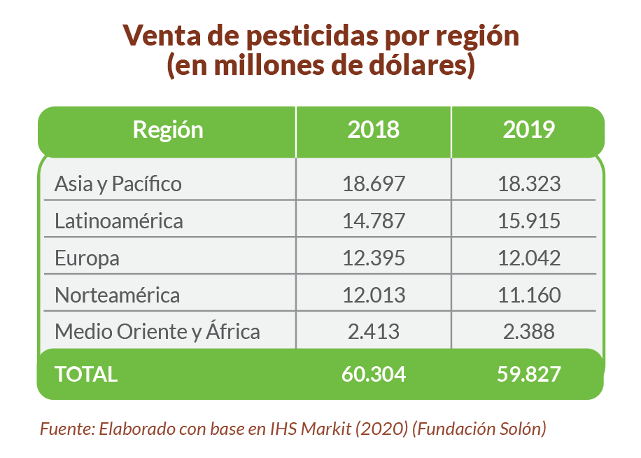 En 2019, y luego de sortear la contracción de las ventas durante los años 2015 y 2016, Latinoamérica asentaba su posición como la segunda región de más ventas de pesticidas, superada por Asia y el Pacifico. Durante ese año las ventas en los países latinoamericanos llegaron a los 15.915 millones de dólares -un aumento de 7 % con relación a la gestión 2018- siendo particularmente Brasil y Argentina los principales promotores de esta expansión (IHS Markit, 2020).