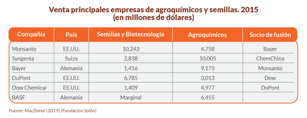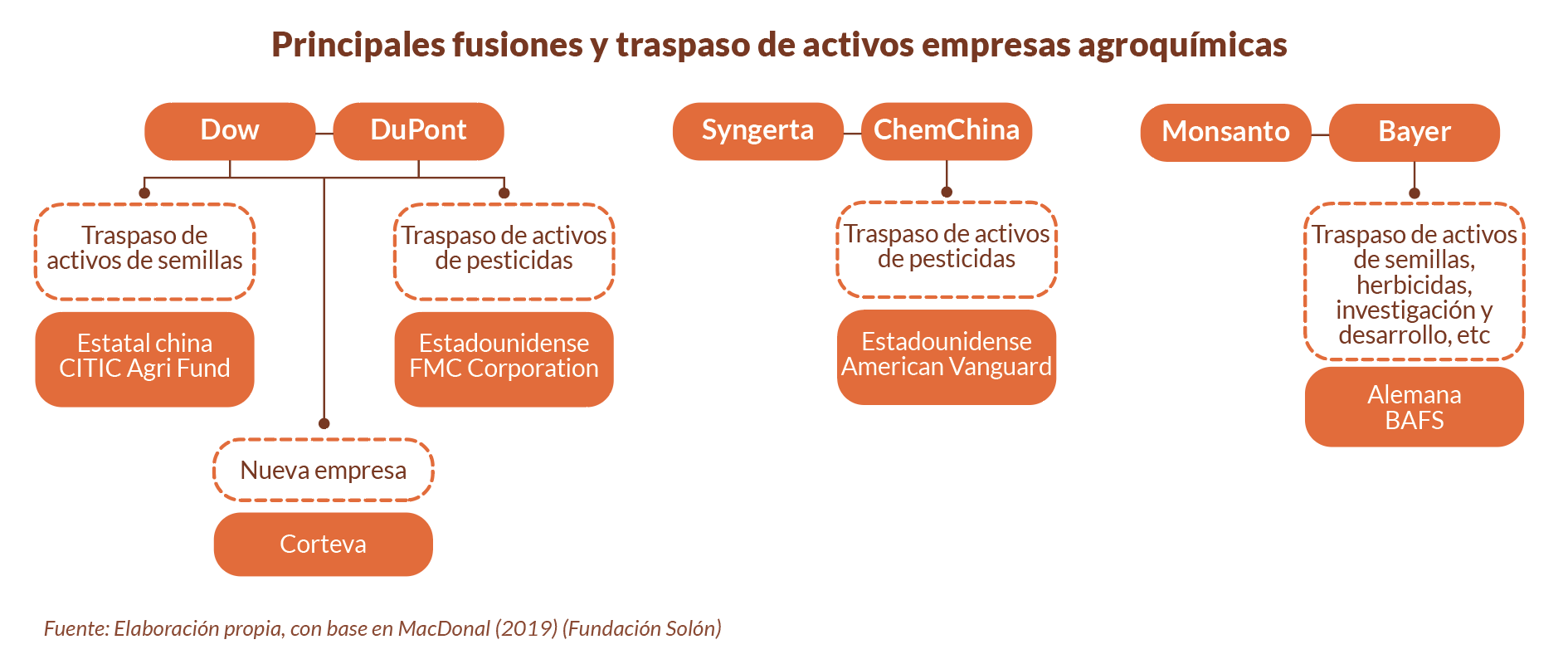 Entre 2017 y 2018 se concretaron las fusiones entre Dow Chemical y DuPont, ChemChina y Syngenta, y Bayer y Monsanto. Debido a las observaciones de las autoridades antimonopolio, la fusión de estas empresas derivó en el traspaso de algunos activos a otras empresas y en la creación de unas nuevas. Por ejemplo, DuPont vendió parte de sus activos en mercados de pesticidas (herbicidas de control de malezas en el trigo de invierno) a la estadounidense FMC Corporation –empresa especializada en productos derivados de litio– mientras que Dow vendió activos en semillas de maíz a la estatal china CITIC Agri Fund. De la fusión entre Dow y DuPont surgió una nueva empresa llamada Corteva, una sub-empresa independiente y especializada en semillas e insumos químicos (MacDonald, 2019).
