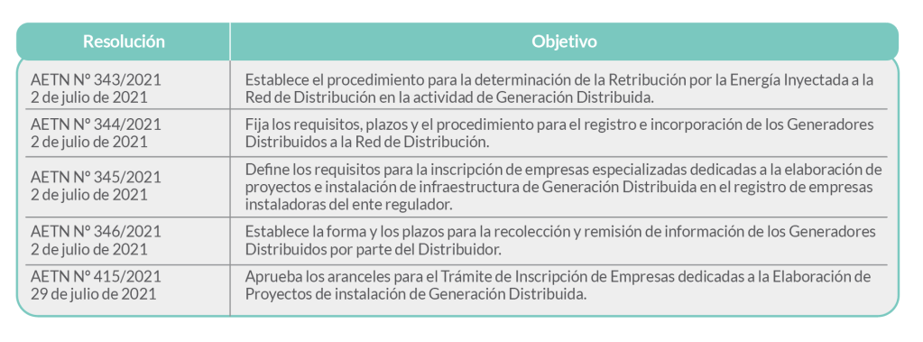 - Resolución AETN Nº 343/2021 del 2 de julio de 2021: Procedimiento para la determinación de la Retribución por la Energía Inyectada a la Red de Distribución en la actividad de Generación Distribuida.