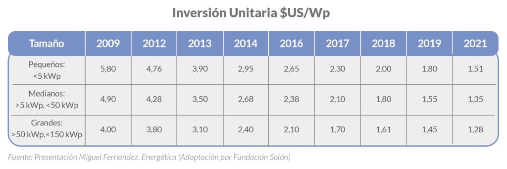 Esta normativa no favorece la instalación de sistemas más grandes a pesar de que sus costos son más bajos debido a las economías de escala. De acuerdo a datos de Energética, los costos de instalación de los sistemas fotovoltaicos se han reducido a casi un tercio de su valor en la última década, y la inversión unitaria en dólares por vatio de potencia ($US/Wp) es más barata para los sistemas más grandes. En el siguiente cuadro al 2021, un sistema pequeño de una capacidad igual o menor a 5 kWp costaría 1,51 $US/Wp, uno mediano tendría un costo de 1,35 $US/Wp, y uno grande reduciría su costo a 1,28 $US/Wp.