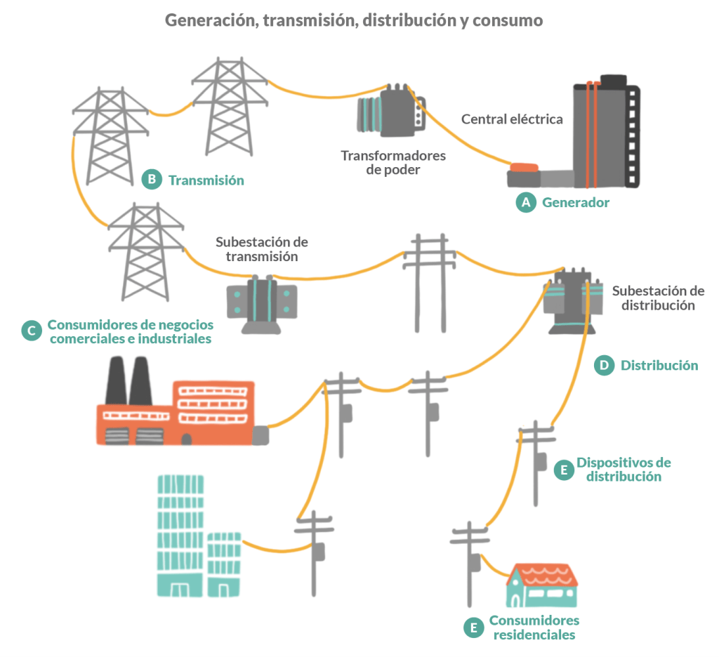 - La Distribución comprende el traslado de la electricidad hasta los consumidores finales (viviendas, industrias, comercio y servicios). Por ejemplo, Delapaz, CRE, ELFEC, SETAR, entre otras, son empresas de Distribución en cada departamento del país.