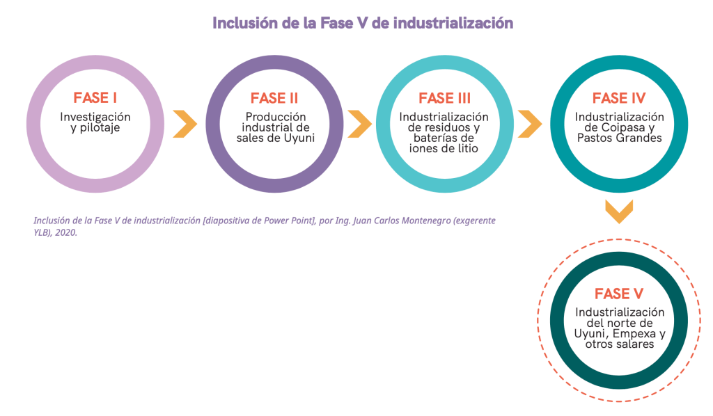 A principios del 2020, en una nueva presentación del Ing. Montenegro, cuando ya había dejado de ser gerente de YLB, se añadió una quinta fase titulada “Industrialización Norte de Uyuni, Empexa, otros salares.”